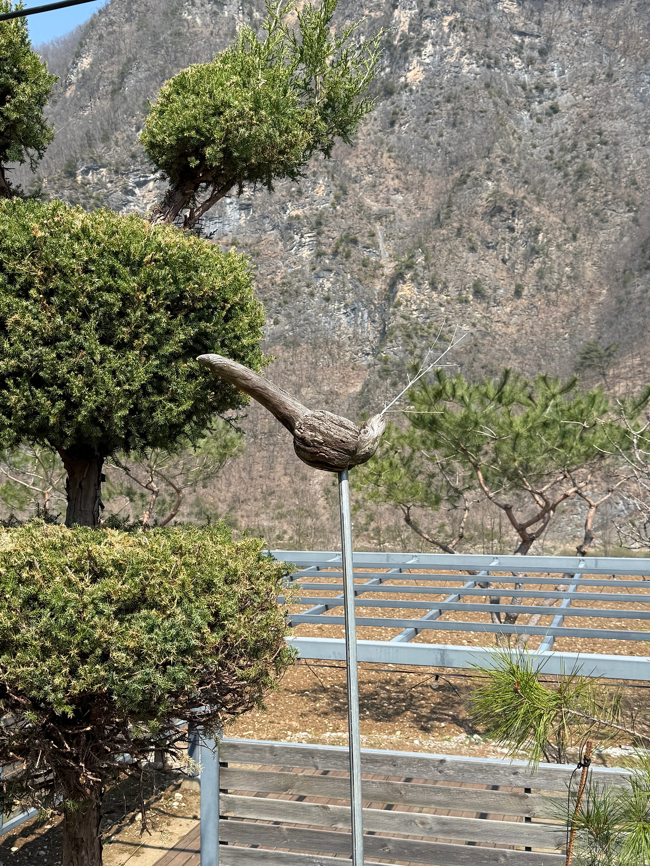 “아 그게 처음 만든 솟대 중 하나예요. 원래 그냥 도토리 같은걸 몸통으로 해서 얇은 나뭇가지 같은 것들을 주워다 깎아서 꼽았는데, 그러다 보니까 새들이 자꾸 날아와서 쪼아 먹더라고요. 그래서 그 뒤로 나무로만 만들었어요.”