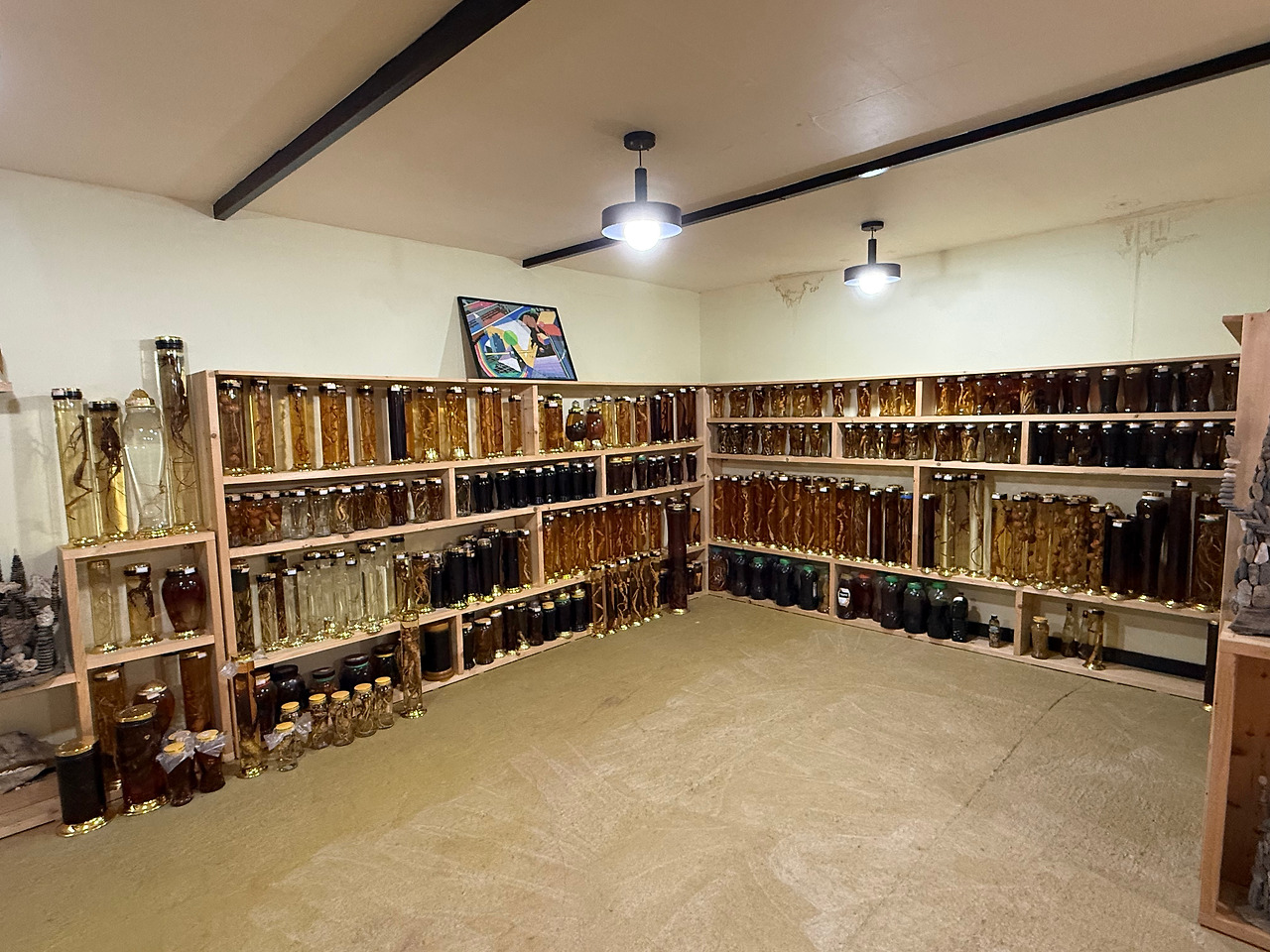 “저거는 제가 봄마다 나물을 캐면, 제일 좋은 것들로 술을 담가요. 이거는 제가 해가 지면 작업하는 솟대들이고요.”