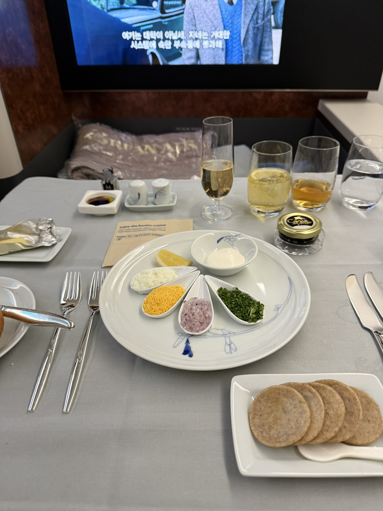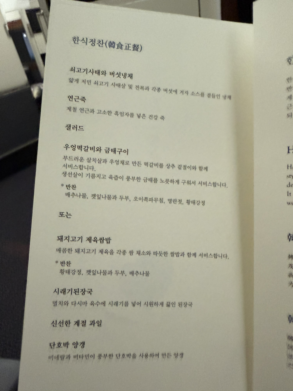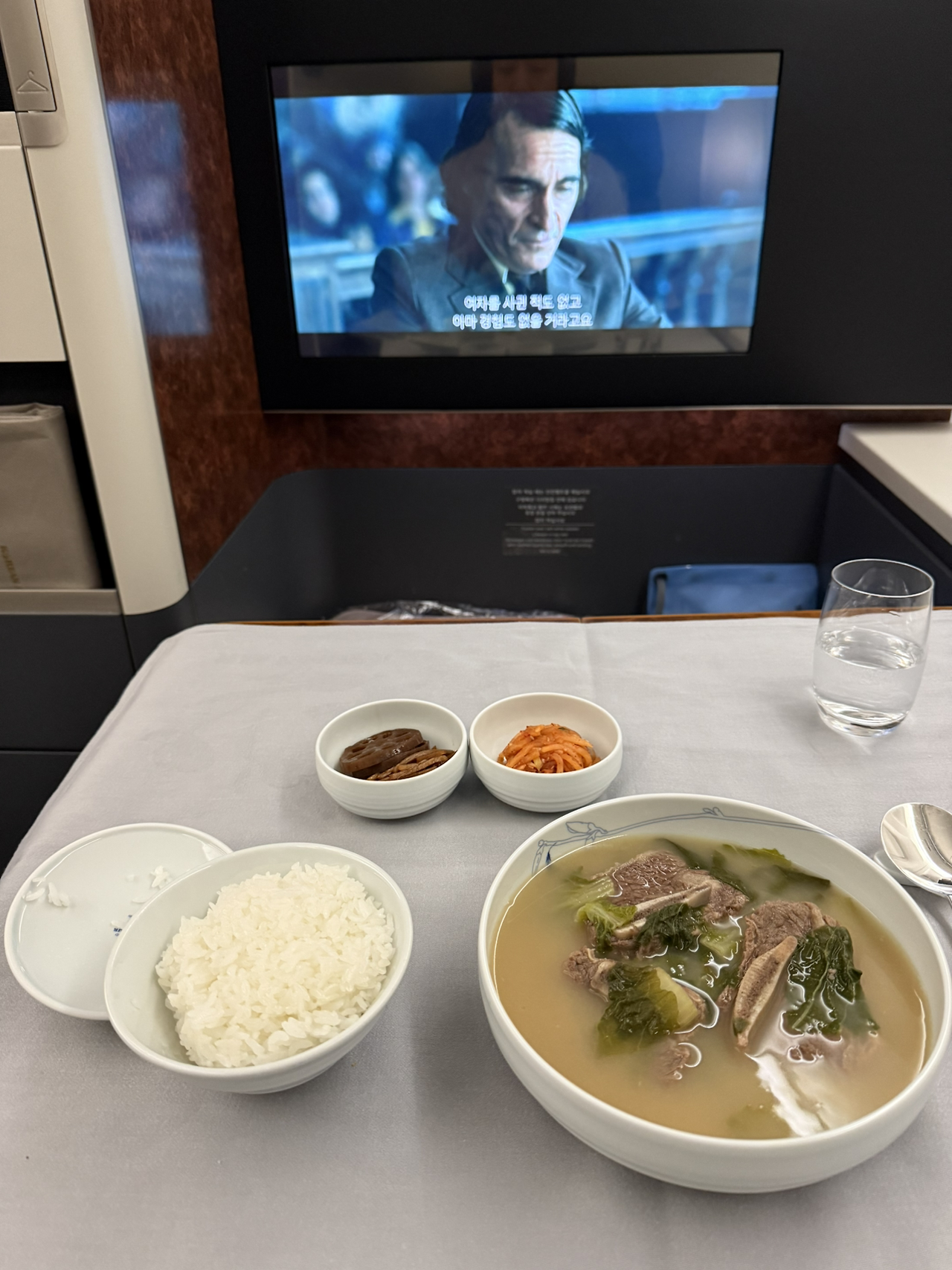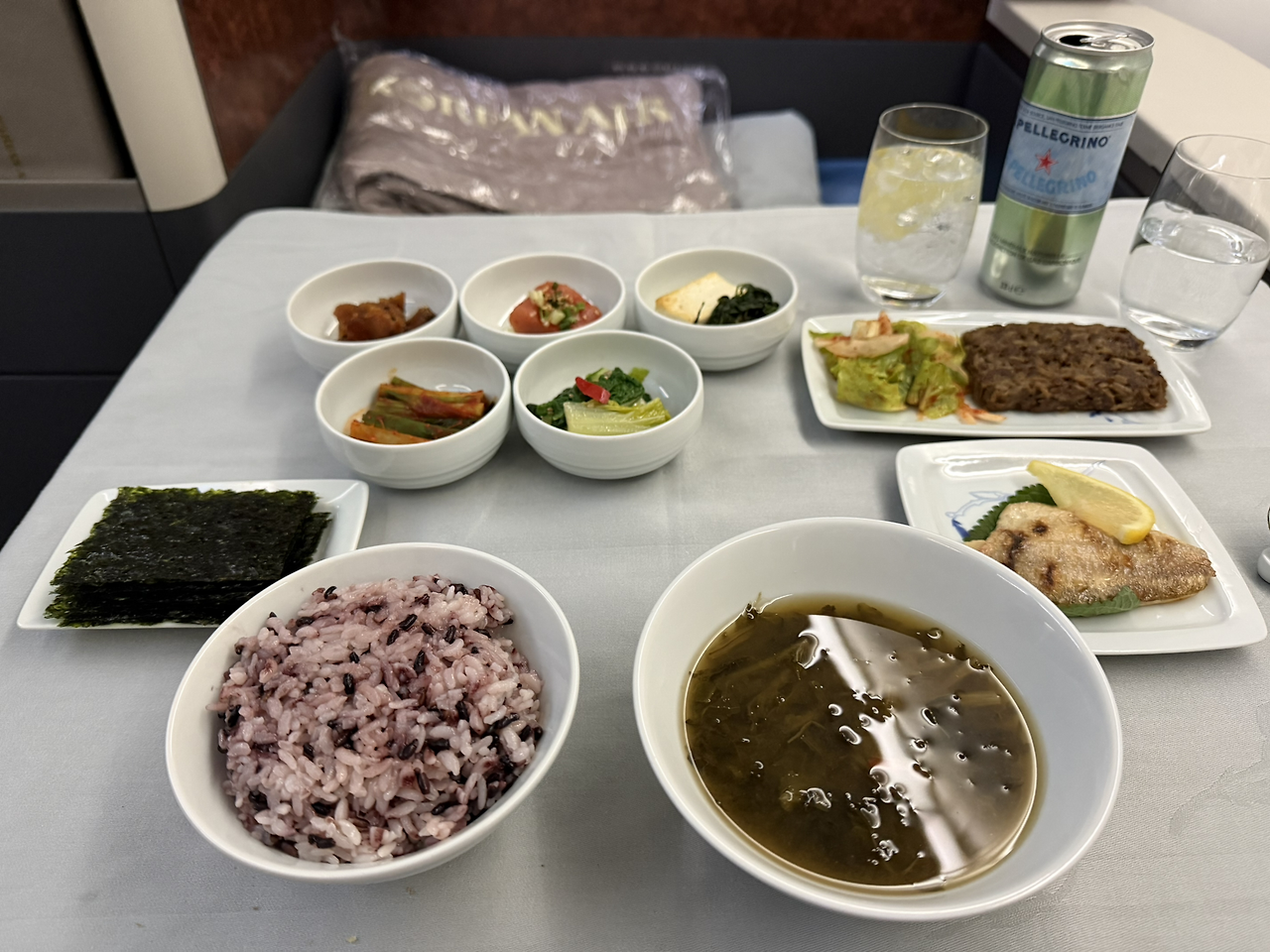 앉자마자 승무원들이 차를 권하고 식사에 대해 디테일하게 조율했다. 서빙시간, 방식, 메뉴 등등 모든 것이 내가 원하는 대로 다 맞춰주는 시스템이었다. 정말이지 새로운 차원의 서비스를 경험할 수 있었다. 내가 약간 컨디션이 안 좋다고 이륙직후 먹는 식사를 조금 미루고 싶다고 하니, 당연히 맞춰드리겠다면서 이불을 펴드릴까요?라고 먼저 물어보았다. 덕분에 이륙하자마자 다른 승객들은 식사할 때 나는 두 시간정도 자고 회복한 후 편하게 식사를 할 수 있었다. 중간에 자느라 라면은 못 먹고, 소화가 안되어 전부 한식으로 먹었다. 단순히 데우는 식사가 아니고 방금 주방에서 조리한 컨디션으로 음식이 나왔다. 최근에 먹은 한식 중에 가장 훌륭했다. 위스키는 기본이 조니워커블루부터 시작했고, 와인 셀렉션은 대부분 병당 수십만 원을 호가하는 듯 보였다. 차나 음료도 가장 고급 브랜드였고 모든 것이 최고급이었다.