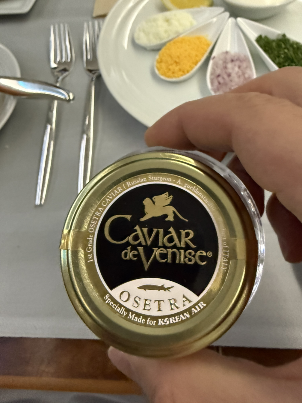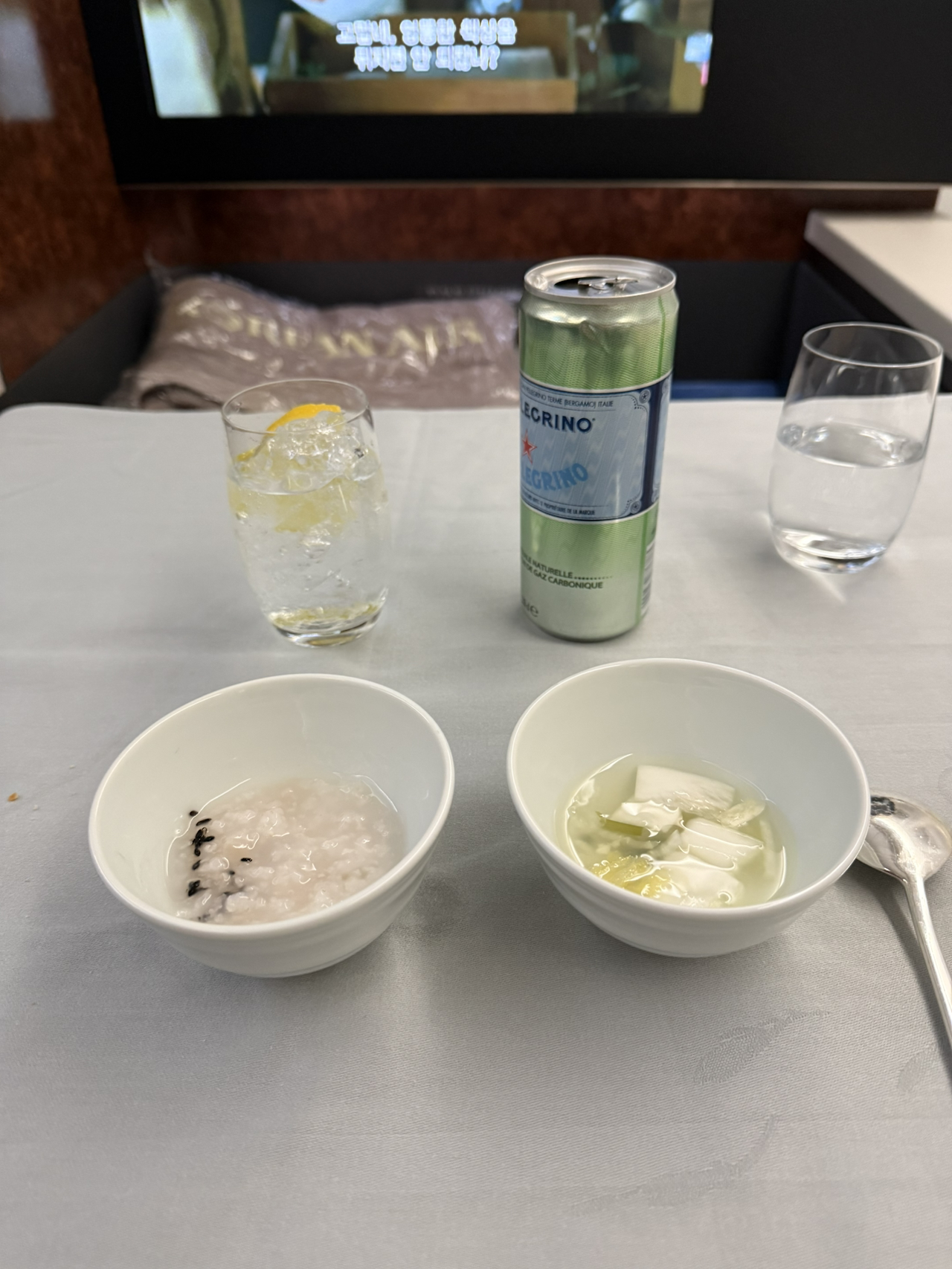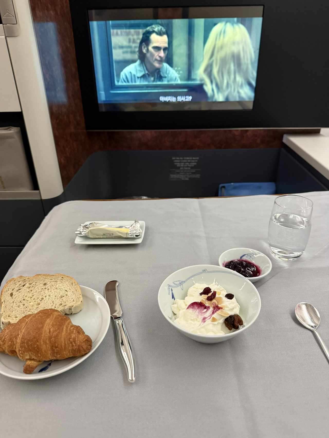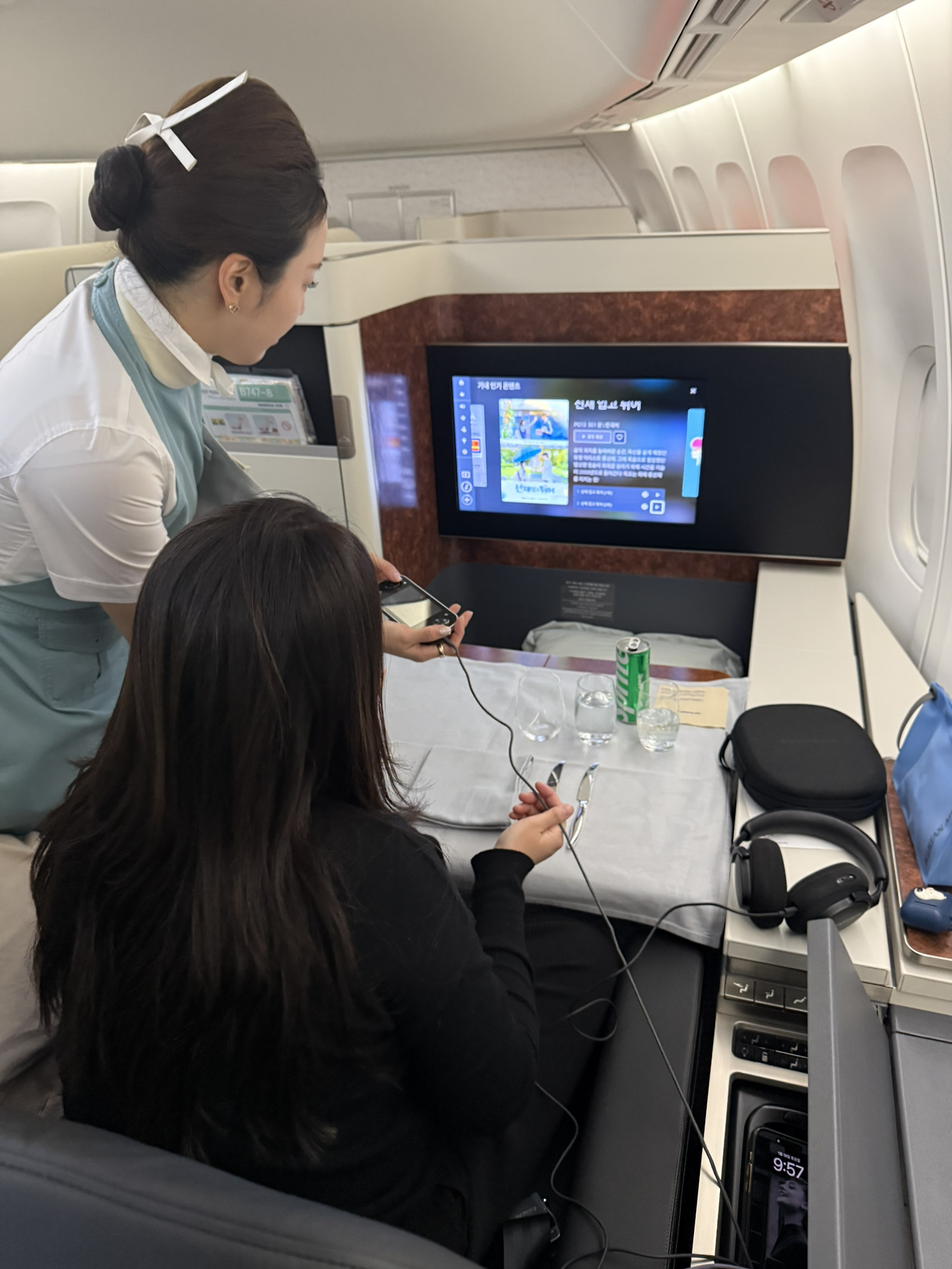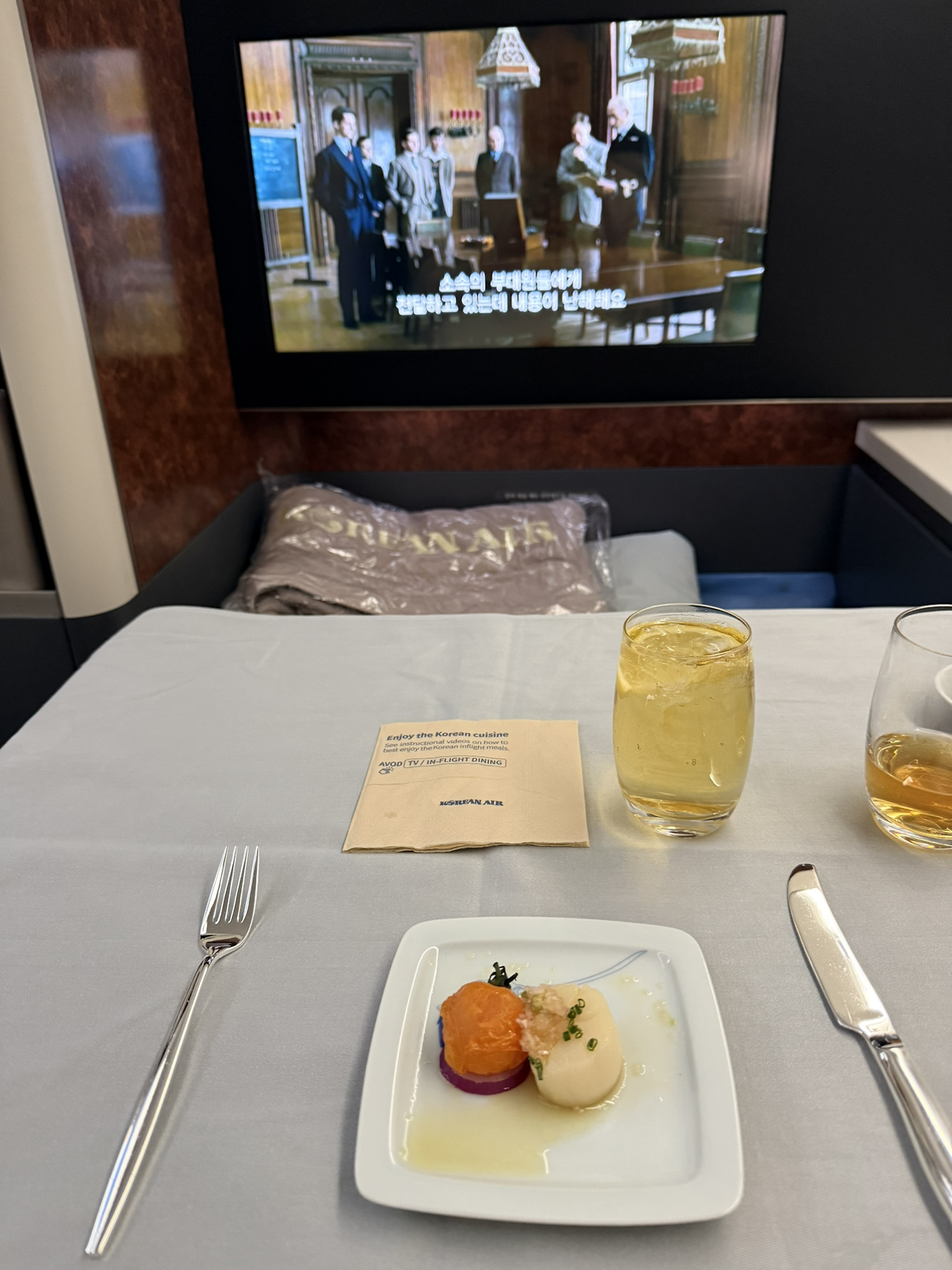 앉자마자 승무원들이 차를 권하고 식사에 대해 디테일하게 조율했다. 서빙시간, 방식, 메뉴 등등 모든 것이 내가 원하는 대로 다 맞춰주는 시스템이었다. 정말이지 새로운 차원의 서비스를 경험할 수 있었다. 내가 약간 컨디션이 안 좋다고 이륙직후 먹는 식사를 조금 미루고 싶다고 하니, 당연히 맞춰드리겠다면서 이불을 펴드릴까요?라고 먼저 물어보았다. 덕분에 이륙하자마자 다른 승객들은 식사할 때 나는 두 시간정도 자고 회복한 후 편하게 식사를 할 수 있었다. 중간에 자느라 라면은 못 먹고, 소화가 안되어 전부 한식으로 먹었다. 단순히 데우는 식사가 아니고 방금 주방에서 조리한 컨디션으로 음식이 나왔다. 최근에 먹은 한식 중에 가장 훌륭했다. 위스키는 기본이 조니워커블루부터 시작했고, 와인 셀렉션은 대부분 병당 수십만 원을 호가하는 듯 보였다. 차나 음료도 가장 고급 브랜드였고 모든 것이 최고급이었다.