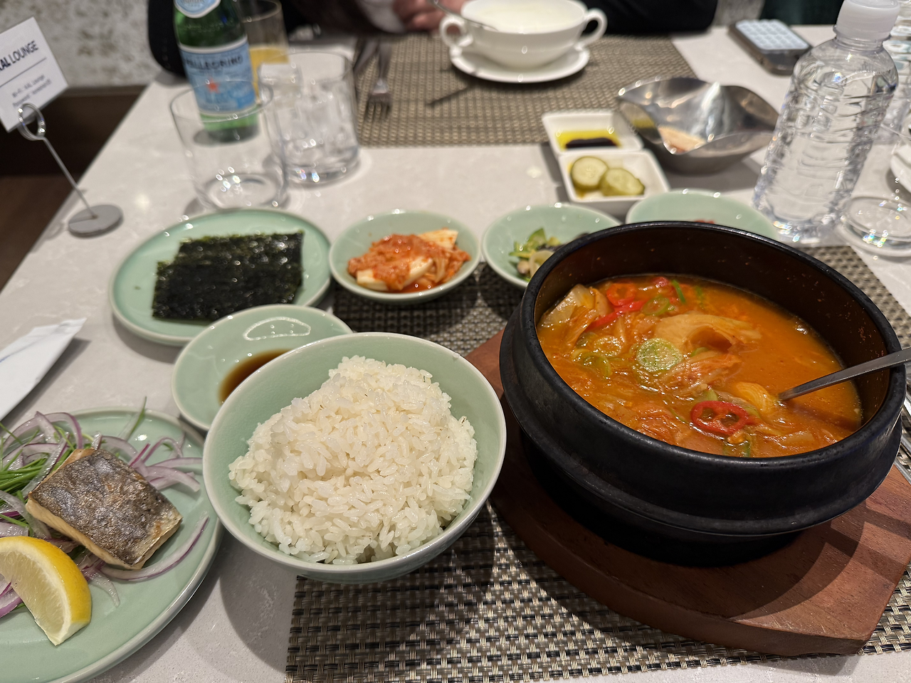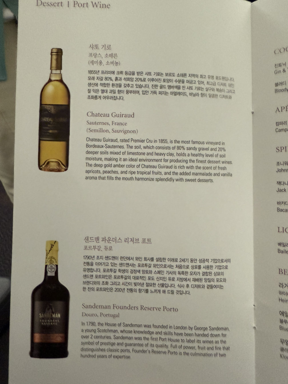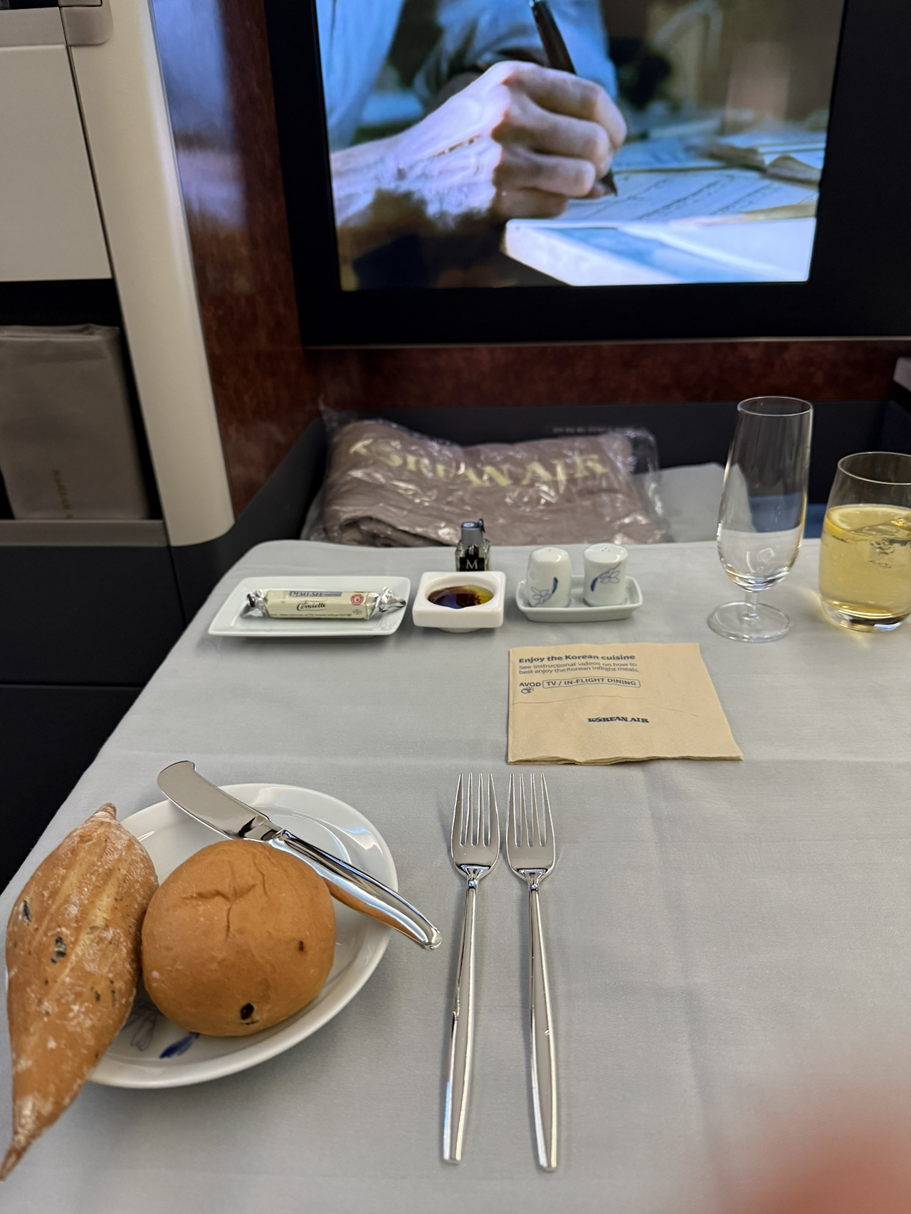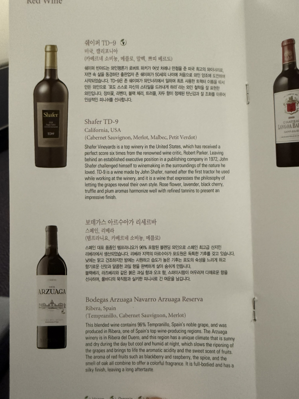 앉자마자 승무원들이 차를 권하고 식사에 대해 디테일하게 조율했다. 서빙시간, 방식, 메뉴 등등 모든 것이 내가 원하는 대로 다 맞춰주는 시스템이었다. 정말이지 새로운 차원의 서비스를 경험할 수 있었다. 내가 약간 컨디션이 안 좋다고 이륙직후 먹는 식사를 조금 미루고 싶다고 하니, 당연히 맞춰드리겠다면서 이불을 펴드릴까요?라고 먼저 물어보았다. 덕분에 이륙하자마자 다른 승객들은 식사할 때 나는 두 시간정도 자고 회복한 후 편하게 식사를 할 수 있었다. 중간에 자느라 라면은 못 먹고, 소화가 안되어 전부 한식으로 먹었다. 단순히 데우는 식사가 아니고 방금 주방에서 조리한 컨디션으로 음식이 나왔다. 최근에 먹은 한식 중에 가장 훌륭했다. 위스키는 기본이 조니워커블루부터 시작했고, 와인 셀렉션은 대부분 병당 수십만 원을 호가하는 듯 보였다. 차나 음료도 가장 고급 브랜드였고 모든 것이 최고급이었다.