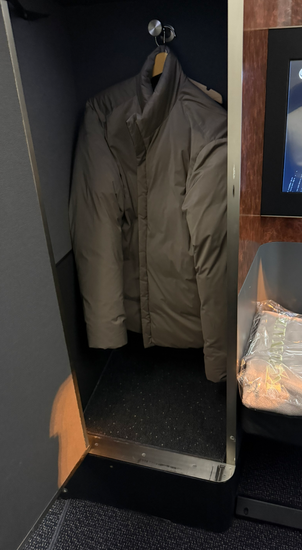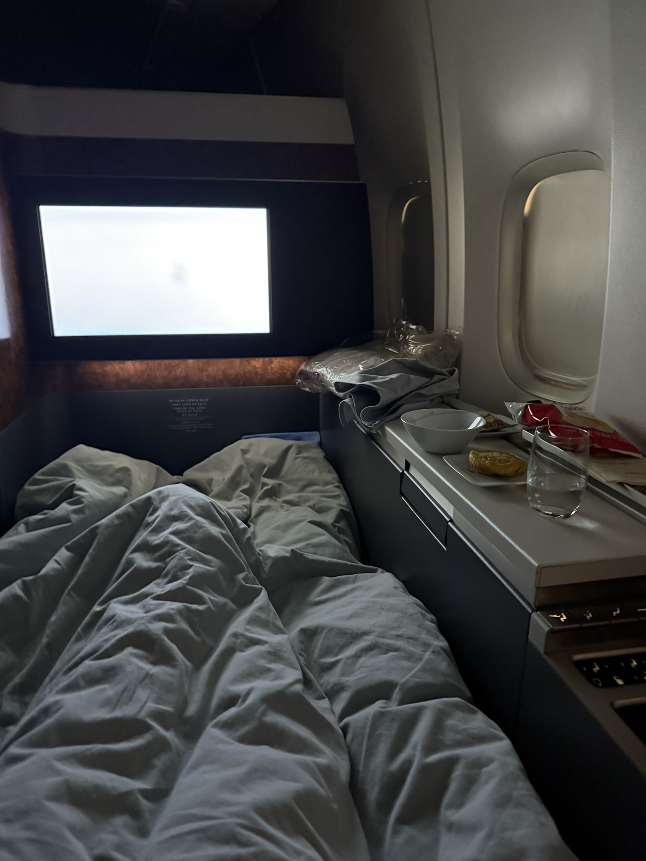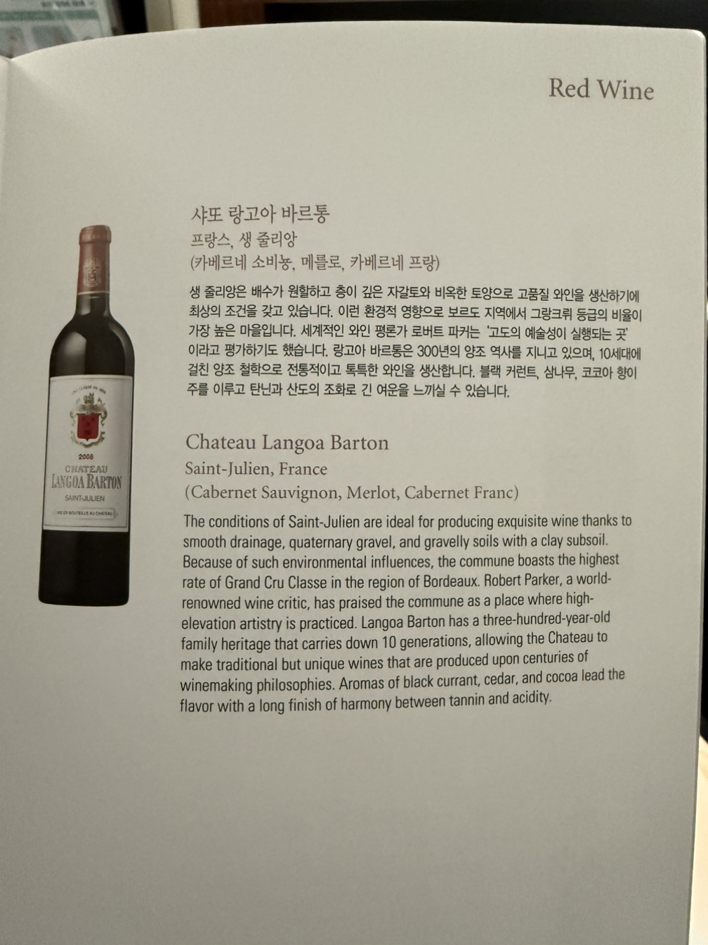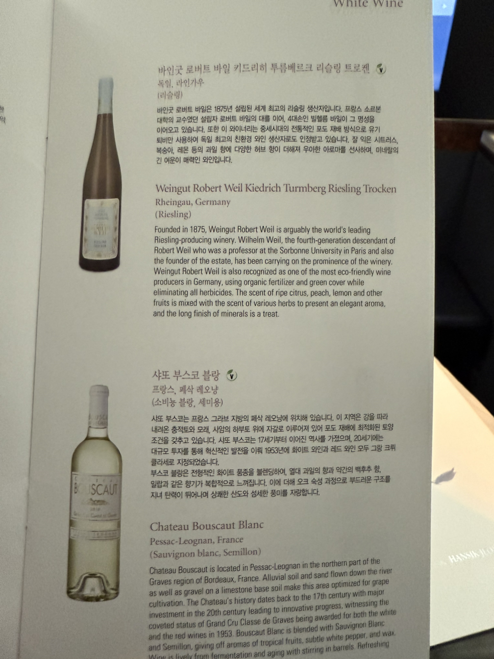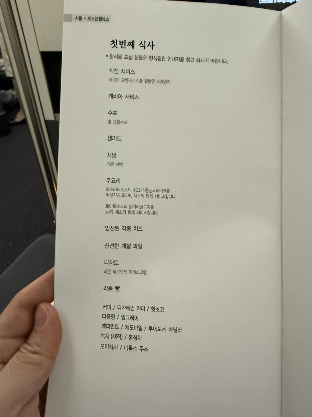 앉자마자 승무원들이 차를 권하고 식사에 대해 디테일하게 조율했다. 서빙시간, 방식, 메뉴 등등 모든 것이 내가 원하는 대로 다 맞춰주는 시스템이었다. 정말이지 새로운 차원의 서비스를 경험할 수 있었다. 내가 약간 컨디션이 안 좋다고 이륙직후 먹는 식사를 조금 미루고 싶다고 하니, 당연히 맞춰드리겠다면서 이불을 펴드릴까요?라고 먼저 물어보았다. 덕분에 이륙하자마자 다른 승객들은 식사할 때 나는 두 시간정도 자고 회복한 후 편하게 식사를 할 수 있었다. 중간에 자느라 라면은 못 먹고, 소화가 안되어 전부 한식으로 먹었다. 단순히 데우는 식사가 아니고 방금 주방에서 조리한 컨디션으로 음식이 나왔다. 최근에 먹은 한식 중에 가장 훌륭했다. 위스키는 기본이 조니워커블루부터 시작했고, 와인 셀렉션은 대부분 병당 수십만 원을 호가하는 듯 보였다. 차나 음료도 가장 고급 브랜드였고 모든 것이 최고급이었다.