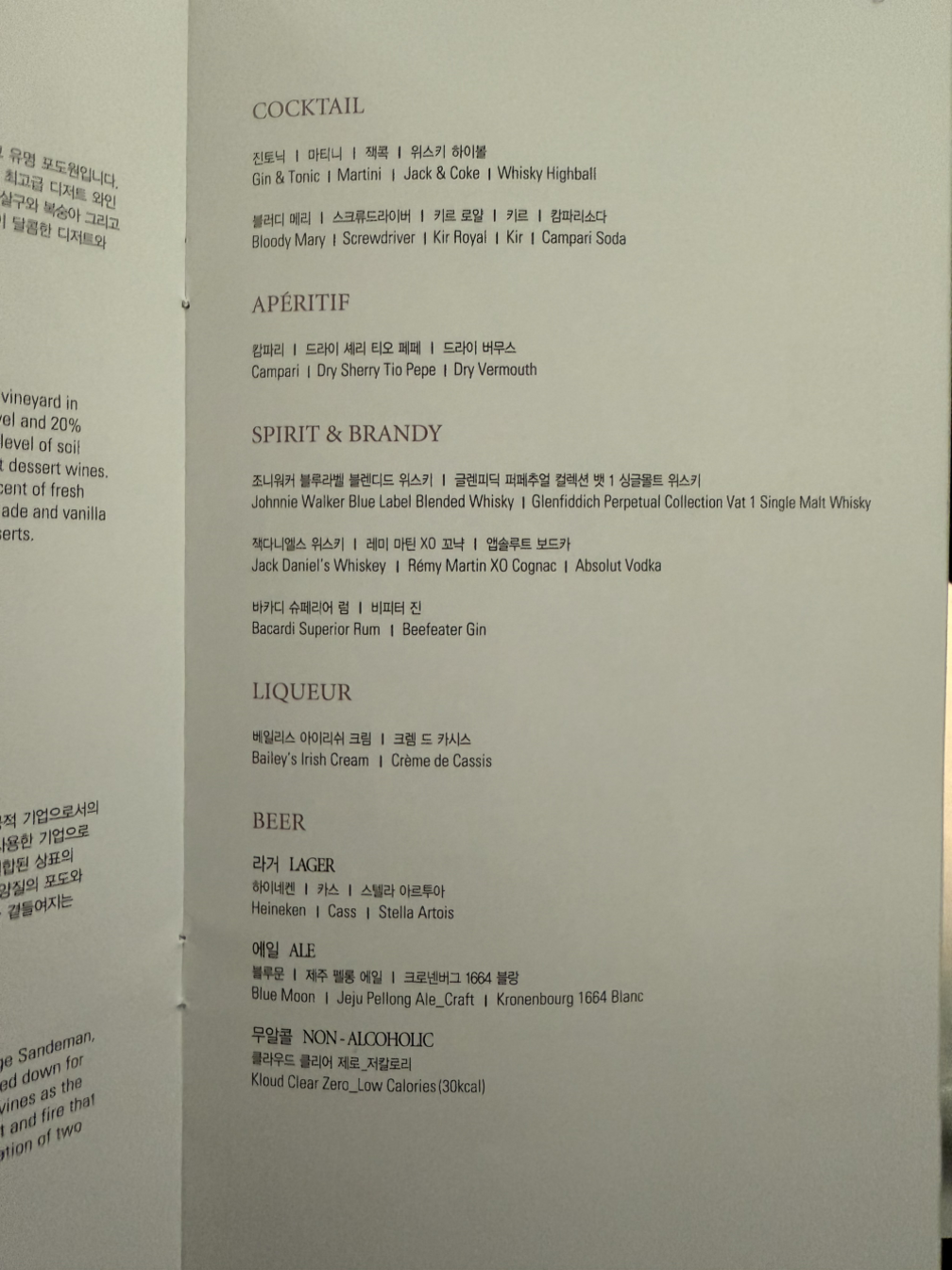 라운지 안으로 입장하니, 그동안 다녔던 라운지들과는 차원이 달랐다. 훨씬 넓고 깔끔하고 고급스러웠다. 시간이 5시쯤 되어서인지 직원이 바로 식사자리에 착석할 것을 권했다. 메뉴는 최고급 안심 스테이크부터 샌드위치까지 다양했고 주문하면 조리를 시작하며 20분 정도 걸린단다. 아내는 안심스테이크를 나는 김치찌개한상을 시켰다. 술도 셀렉션이 좋았다. 싱글몰트류도 수준이 높았고, 꼬냑은 XO등급이었다. 식전주로 꼬냑을 온더록해서 먹고 식사를 마쳤다. 갑자기 빈속에 도수가 높은 술을 마셔서인지 소화가 안돼서 일등석에서 음식과 술을 많이 못 먹었다..