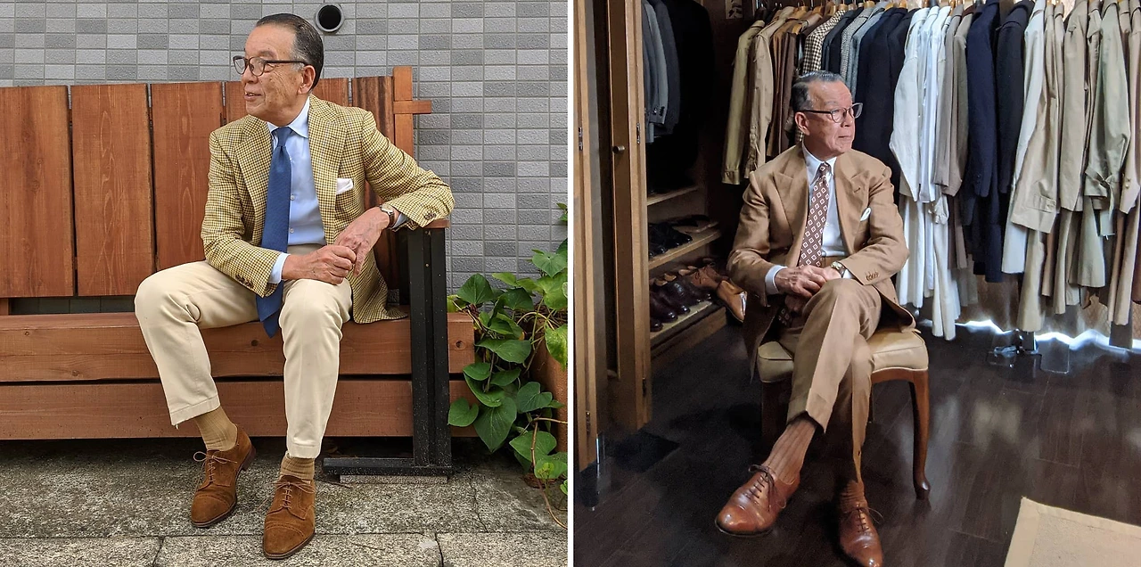 밝은 색상의 수트: 위의 사진에서 우리는 베를린의 니엘과 유키오 아카미네가 탠 색상 구두를 도브 그레이와 탠(황갈색)과 같은 밝은 색상의 수트와 함께 착용한 것을 볼 수 있다. 전체 착장의 색상이 밝기에 구두 역시 튀어 보이지 않는다. 언급돼야 할 것은 오늘의 남성들이 밝은 색의 수트를 입을 기회가 몇 번 없다고 느낀다는 사실이다. 수트는 포멀한 혹은 음울한 행사에만 입는 옷으로 전락했고, 반면 밝은 색 수트는 비교적 캐주얼한 선택지로 인식되고 있기 때문이다.