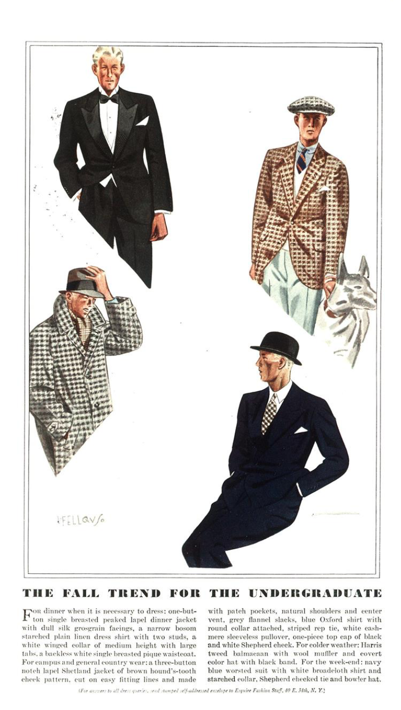 2006년 작고한 일본의 스타일 작가 오치아이 마사카츠는 “남자가 옷에 대한 이야기를 하는 것은 어쩐지 좀...이라는 풍조[는]...이야기를 하고 싶어도 할 수 없는 것에 대한 변명에 가깝다 “고 지적한 바 있다. 남성들의 옷에 대한 무지는 의복에 관한 대화를 점잖지 못한 것으로 전락시켰고, 이는 차라리 옷을 향한 무관심이 남자다운 것이라는 편견을 탄생시켰다. (오치아이 마사카츠 인용)