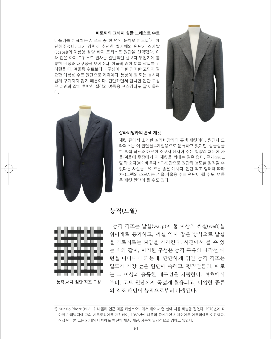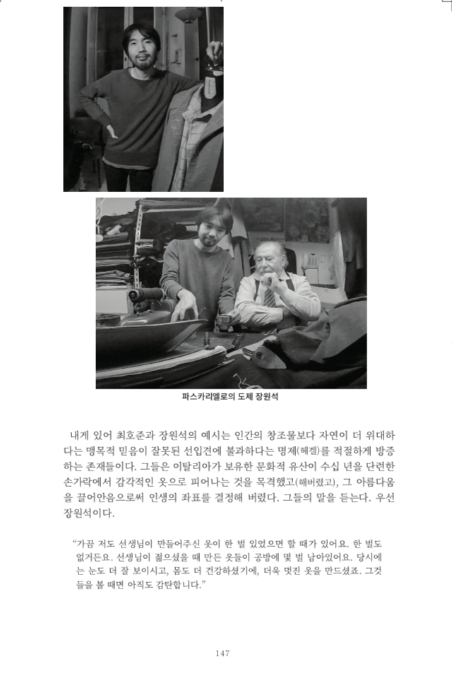 우선 재단 재봉에 생을 바친 장인들의 이야기를 담았다. 무엇보다 책의 주인공, 마에스트로 안토니오 파스카리엘로와의 만남은 결정적이었다(챕터 9, 11, 12의 경우 그가 없었다면 시작조차 할 수 없었을 테다). 책의 모든 내용이 그의 언어로 새로이 세례를 받아야 했다. 독자는 내가 그간 안토니오 파스카리엘로, 사르토리아 나폴레타나, 나폴리에 빠져버렸다는 사실을 책을 펼치는 순간 알아챌 수 있을 테다. 나는 한 친구에게 이 책이 “나폴리로 향하는 러브레터”라고 소개했는데, 이 역시 틀린 설명은 아니다.
