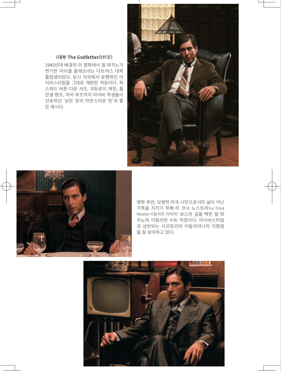 “난 태어나서부터 늘 이렇게 옷을 입어왔다!”라는 거만함/시침 떼기로 대표되는 아이비스타일의 미학 역시 미국의 최상류 층 자제들, 더 멀리는 그들이 모방했던 영국 젠트리의 규율을 답습하고 있다. 그들에게 있어서 손에 익은, 즉 자연스럽게 몸에 밴 우아함이야말로 추구해야 할 유일한 이상향이었다. 우리는 위대한 개츠비 중 제이 개츠비가,