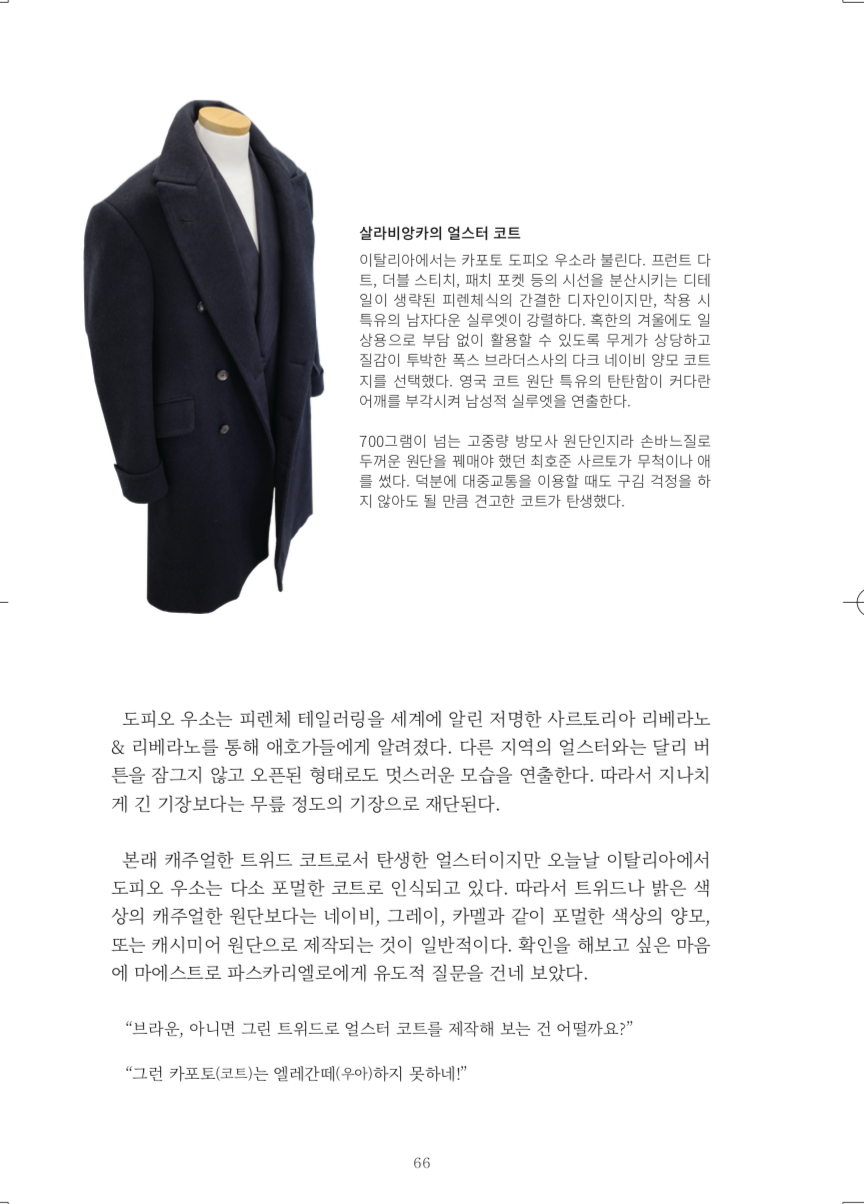 한국의 겨울 날씨와 의복 문화를 감안했을 때 수미주라 오버코트보다 클래식 남성복의 범주 내에서 더 ‘제 값을’하는 옷은 없을 테다. 활용이 쉬우면서, 걸치기 부담스럽지 않고, 내구성도 좋으며(양모라는 가정하에), 실용성은 말할 것도 없다.