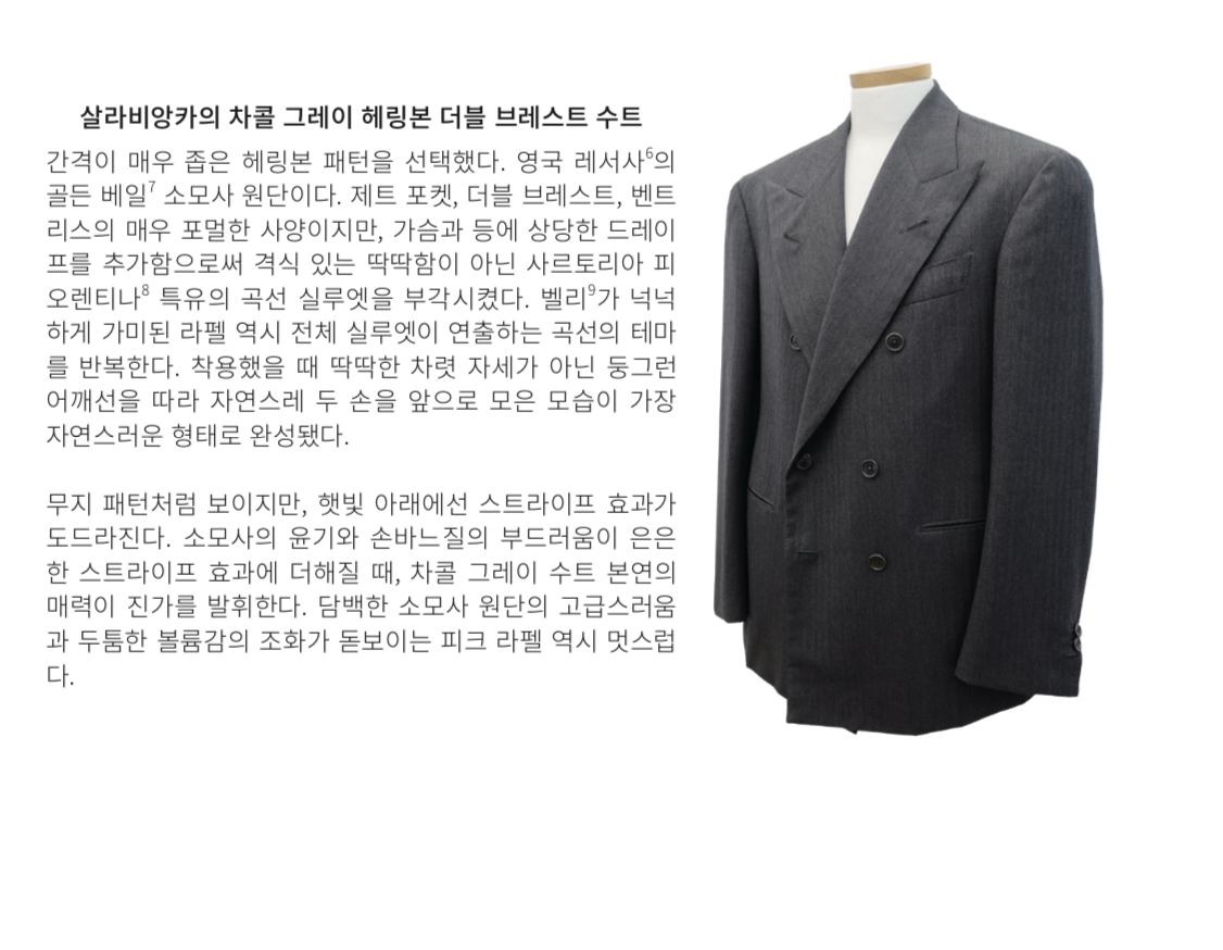 아름다운 옷을 찾아 떠난 여행을 통해 난 그것이 희귀한 존재임을 깨단해야만 했다. 명성 높은 사르토리아의 유명무실한 현재를, 오랜 기다림 끝에 받아 든 수트에서, 포장지도 채 다 뜯기도 전에, 성급히 집어든 재킷의 촉감만으로 단박에 통감하는 허탈함 역시 피할 수 없었던 비용이었다.