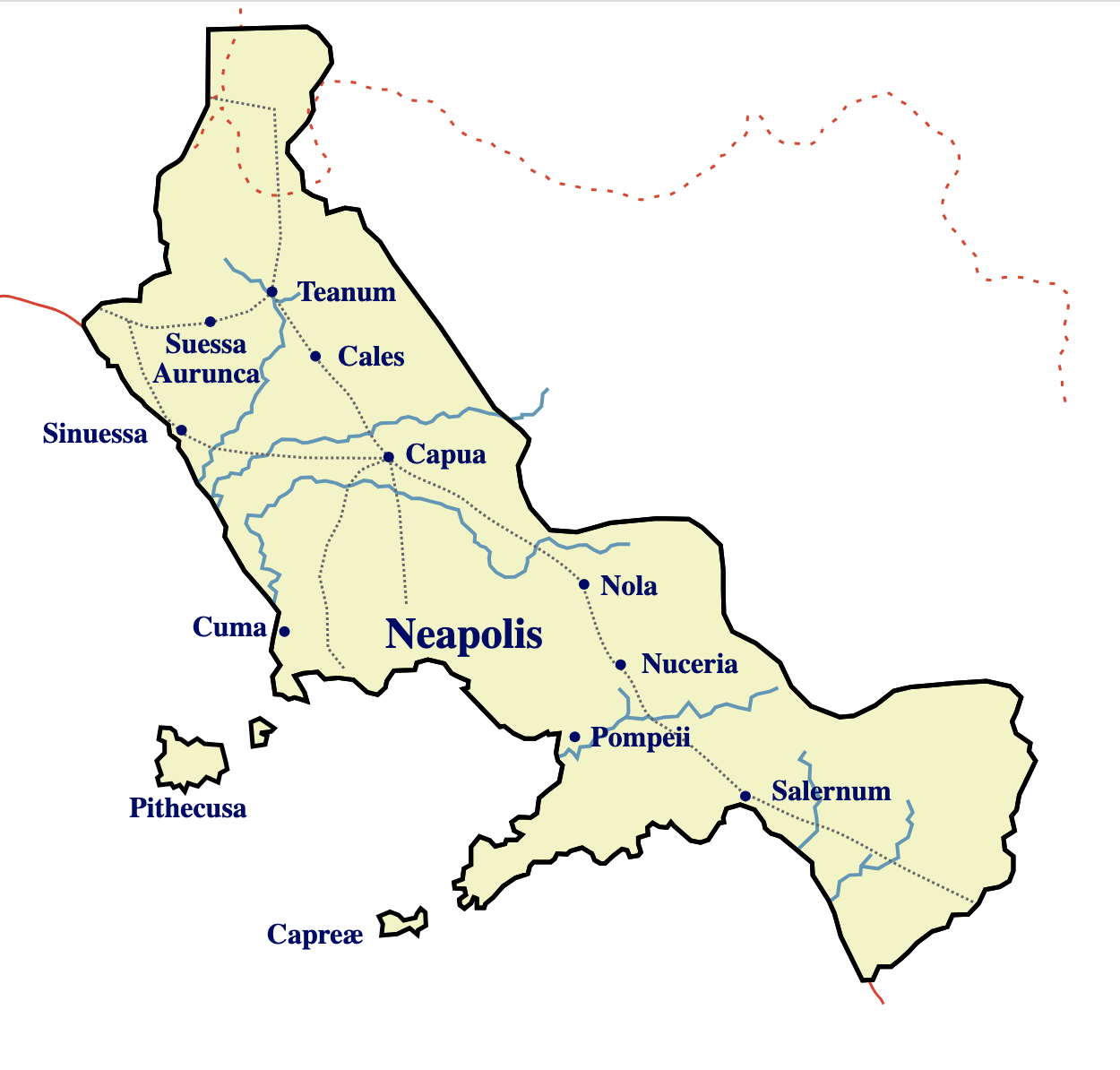 이탈리아의 패권을 두고 치열하게 맞선 둘 사이에서 네아폴리스/나폴리가 취한 자세는 모호했다. 328년에는 로마를 상대로 샘나이족과 연합하여 투쟁하기도 했던 나폴리였지만, 인구의 대부분이 샘나이족으로 이루어진 카푸아, 놀라, 폼페이 등과 달리 나폴리는 인구의 절반 이상이 그리스인으로 구성된 도시였다. 과두정의 지배 세력 상당수 역시 그리스 귀족이었고, 이들은 분명 토속 캄파니인들에 비해 로마에 더 호의적이었다. 나폴리의 지도부가 샘나이 전쟁 내내 친 샘나이 세력과 친 로마 세력으로 첨여하게 분열했던 사실에는 이러한 배경이 자리하고 있었다.