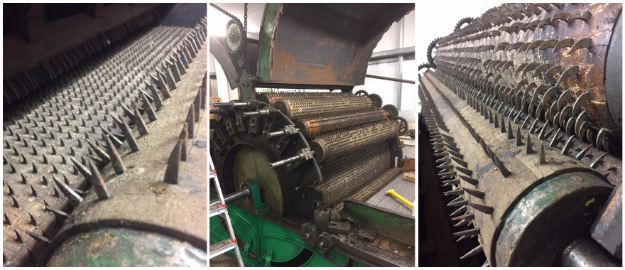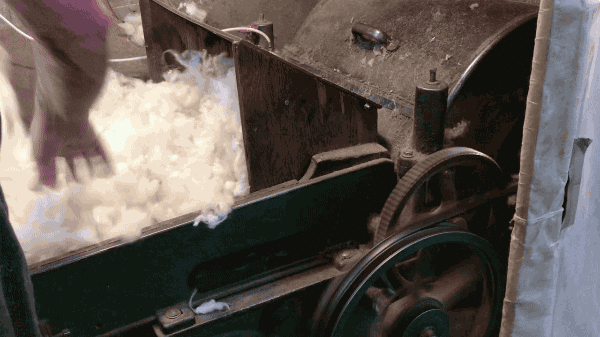 이렇게 라놀린과 오염을 제거시킨 울은 우리에게 익숙한 흰색을 띠게 된다. 이제 Carding이 시작될 차례다. Carding은 쉽게 말해 엉킨 양모를 펴기 위한 빗질과 다르지 않다. Carding Machine은 수백만 개의 미세한 바늘들이 달린 회전하는 드럼통들로 구성돼 있다. 그들은 각자 반대 방향으로 회전하면서 양모를 잡아당기는 거센 빗질을 반복하는데, 이것은 엉킨 양모를 각개의 섬유로 분리해주는 동시에, 양모 사이에 낀 이물질들을 제거한다. 이렇게 단정하게 빗어진 양모 뭉치는 이제 또 한 번의 분류 과정을 거치게 된다.