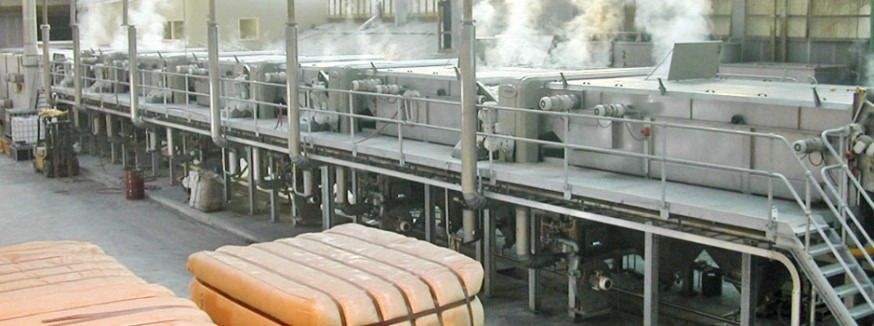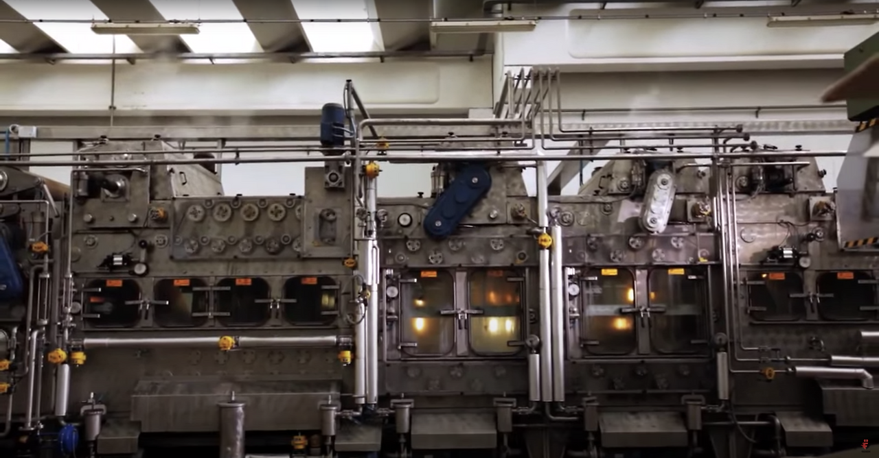 전 세계를 통틀어 양모를 세탁하기 위해 가장 널리 사용되는 scouring machine은 Leviathan이라 불리는 공포스러운 이름의 거대한 세탁기다. 무려 65미터의 길이를 자랑하는 이 괴수는 3-8개의 큰 탱크로 구성돼 있다 (메리노 울을 세척하는 기계들의 탱크 수는 보통 5-6개다). Leviathan에 투입된 양모 뭉치(clumps)들은 5-6개의 탱크에서 반복되는 세척 과정을 거친다. 보통 양모는 각 탱크 안에서 65도의 온수에서 세척되는데, Lanolin(양모지)은 45도에서도 용해되지만, 더 높은 효율성을 위해 65도 온수가 사용된다. 하나의 탱크에서 세척이 끝날 때마다, 사용된 물이 측면에 위치한 사이드 탱크들로 배출되고, 울은 탱크의 끝에서 커다란 스퀴즈 롤러/벨트에 의해 강하게 짓눌려 물을 쏟아낸 후, 다음 탱크에서 같은 과정을 반복한다. 같은 사이클이 5-6번 반복된 후, 마지막으로 헹궈진 양모에는 ‘Spinning oil’ (방직 오일)이 뿌려진다. 이는 앞으로 있을 Carding과 Spinning 과정을 위해 울을 조금 더 부드럽게 만들기 위한 조치다.