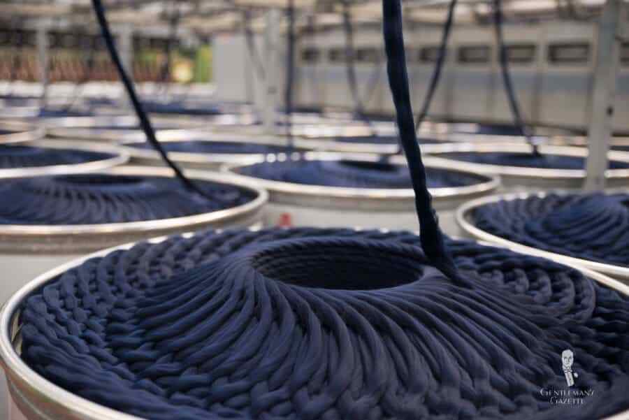 이제 Sliver가 실로 거듭나게 되는 방직 작업의 차례다. Spinning이라고 불리는 방직 과정은 최소 35개의 양모 섬유를 꼬아 실을 만들어내는 작업이다. 균일한 표면의 우스티드 원단을 만들어야 하는 우스티드 실은 방모사 실에 비해 훨씬 단단하게 꼬이게 된다. 이와 같은 과정을 통해 만들어진 소모사 실은 매끈하고, 균일하며, 특유의 광택을 띠는 우스티드 원단을 구성하게 된다.