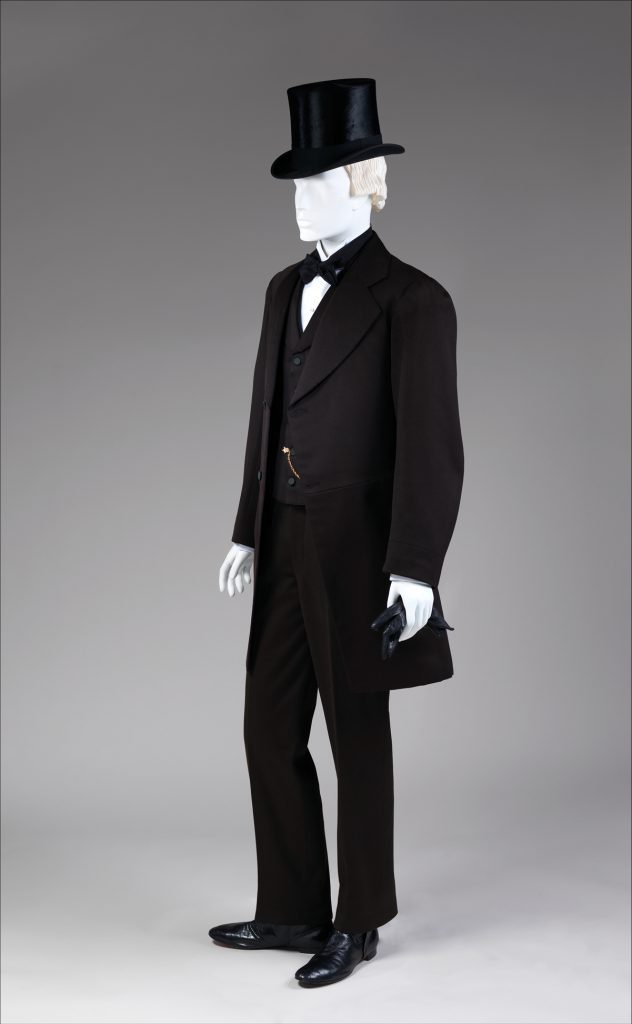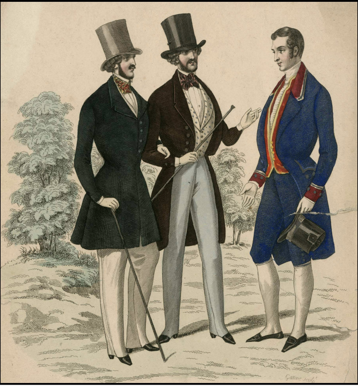 19세기 남성복을 18세기의 그것과 비교했을 때, 가장 눈에 띄는 변화는 역시 의복의 색상이었다. 오늘날 남성 복식의 규정에 있어서 검은색은 장례식장, 혹은 블랙 타이 이벤트가 아니면 피해야 할 선택으로 인식되어 있지만, 19세기 영국의 의회, 증권가, 법정의 유니폼은 검은 프락 코트였다.