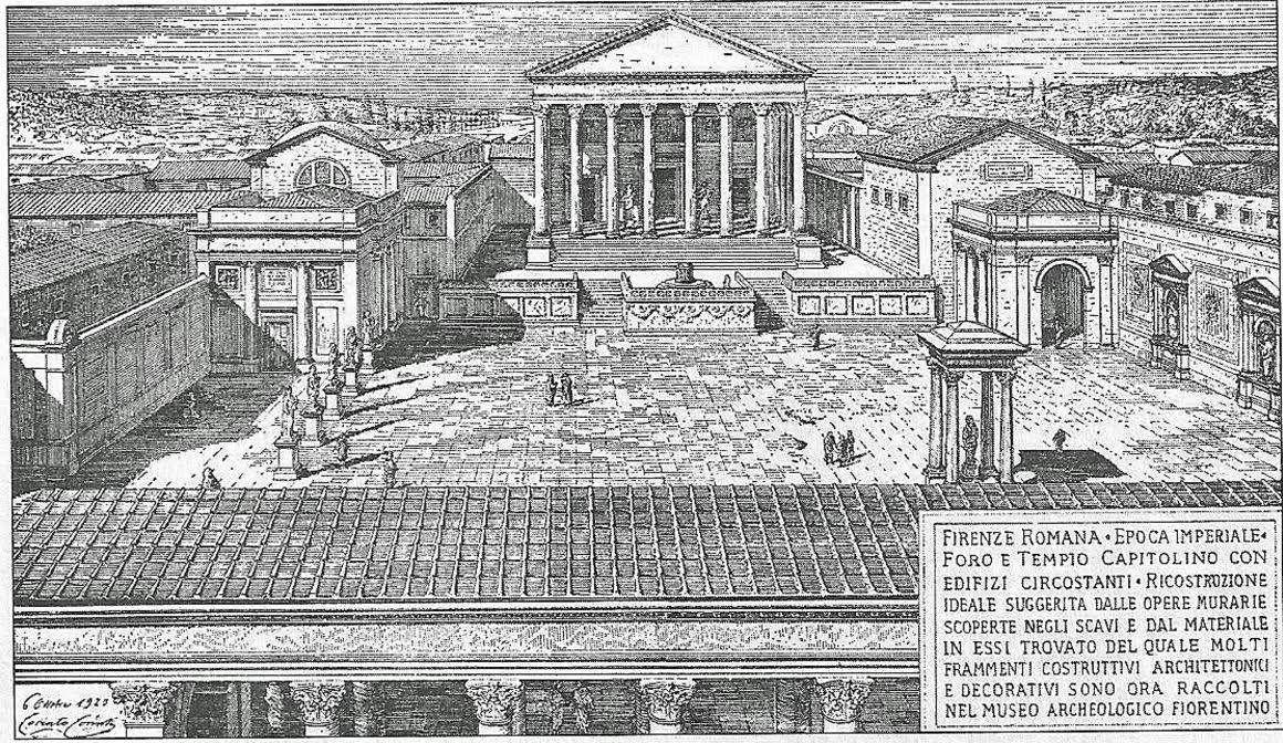 로마인들은 인류 역사를 통틀어 가장 뛰어난 건축기술을 자랑했던 민족이었다. 게다가 그들은 그 어떤 민족보다 그들의 건축물들을 자랑스러워했다(수요가 있어야 공급이 있는 법이다. 오늘날 이탈리아에 남아 있는 수많은 로마의 유적들은 로마인들이 그들의 웅장한 걱축물들을 각별히 사랑했다는 사실을 방증한다). 로마는 플로렌치아의 건설에 앞서 아르노 유역으로 탐사대를 파견했고, 그들은 2000년 도시의 심장이 되어줄 도시의 중심점을 찍어내는 일로 플로렌치아의 건설을 시작했다. 로마제국 도시의 사회, 경제, 종교 정치의 중심이었던 포럼이 위치했던 곳이자, 중세 피렌체의 구(舊) 시장이 자리했으며, 오늘날 피렌체의 피아자 델라 레퓨블리카의 프리 스탠딩 컬럼이 위치한 피렌체의 중심점을 처음으로 짚어낸 것은 로마의 탐사대였다. 그들의 선택은 철저한 로마식 논리를 따르고 있었다.