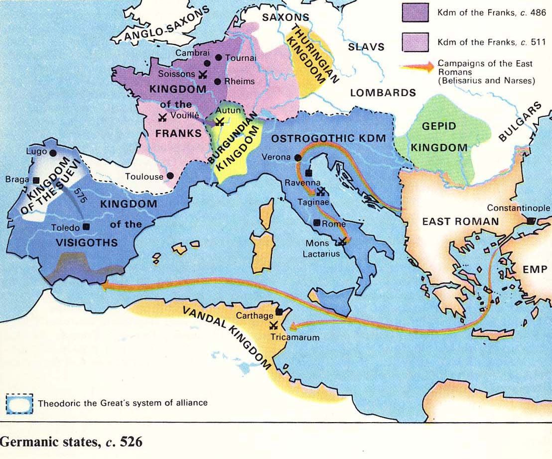 로마의 몰락 이후, 서유럽은 게르만족의 지배 아래 놓이게 된다. 역사학자 남경태의 주장처럼 그것이 차라리 통일 ‘게르만 제국’의 건국으로 이어졌으면 좋았으련만. ‘게르만’은 로마의 관점에서 로마 북쪽의 ‘이방인’을 가리키는 호칭일 뿐이었다. 서기 5세기, ‘게르만’의 이름이 포괄하는 북방 유목 민족들은 제각각의 방식으로 로마의 공백을 메워가고 있었다. 도나우강 연안의 서고트족은 이베리아 반도를, 엘베 강 유역의 반달족은 북아프리카의 옛 카르타고 영토를, 오늘날의 벨기에와 독일 북부 출신의 앵글족, 색슨족, 유트족은 브리타니아를, 흑해 연안에서 남하한 동고트족은 이탈리아 반도를 각각 점령하여 그들의 왕국을 세우고 있었다.