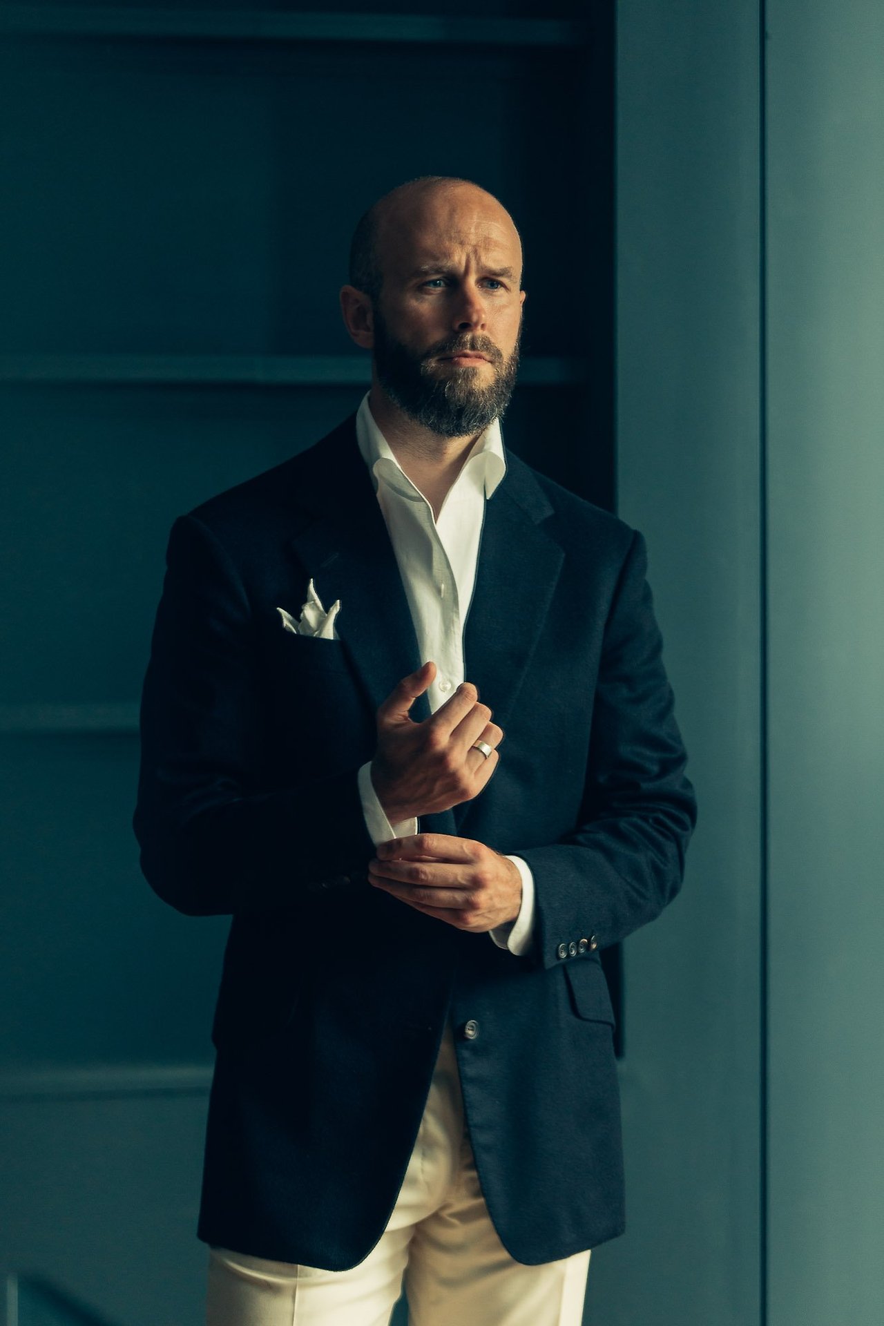 부드럽게 흐르는 드레이프가 특징인 방모사 캐시미어 재킷은 남성 복식 애호가들에게 큰 사랑을 받는 존재다. 네이비 캐시미어 재킷은 울 소재의 네이비 플라넬 재킷과 비교했을 때, 확연히 다른 색감과 착용감을 보여준다. 가끔 마주치는 피아첸차, 로로 피아나, 제냐 등의 빈티지 원단들의 발색은 가히 황홀할 정도다. 트위드와 플라넬의 거친 질감을 같은 색상의 캐시미어로 대체할 수 없듯이, 캐시미어 특유의 멋을 트위드와 플라넬로 대체할 수도 없는 것이다(어느 쪽이 더 훌륭하다고 말하기는 어렵다. 굳이 고르자면 사실 난 편하게 입을 수 있는 양모 원단을 더 선호하는 쪽이다. 그러나 캐시미어 원단이 눈앞에 펼쳐져 있다면 이야기는 달라진다. 그 유혹 앞에서 이성적인 결정을 내리는 일은 매우 어려워지고 만다)