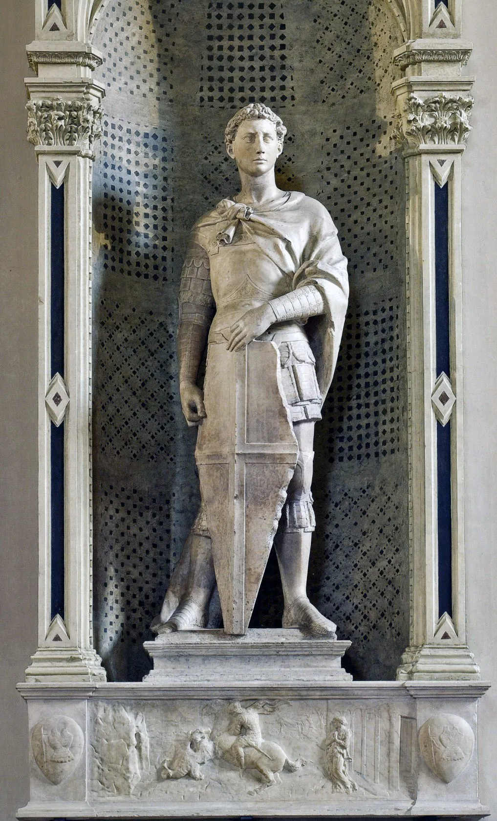 다음으로는 성 게오르기우스상을 살펴보도록 하자. 도나텔로의 초기 작품이며, 오르산미켈레의 벽을 장식하고 있다는 점에서 성 마가상과 동일하다. 갑옷과 무기 제작자 길드, Arte dei Corazzai e Spadai의 주문으로 제작됐으며, 그들의 수호성인이었던 성 게오르기우스를 묘사한 조각품이었다. (황금 전설에 등장하는 로마의 기사 게오르기우스가 왕국에 역병을 퍼뜨리고, 무고한 사람들을 괴롭히던 사악한 용을 죽이고 제물로 바쳐질 운명에 처해있던 공주를 구해내는 내용의 전설을 기반으로 두고 있는 작품이다) 조각상은 용과 전투를 벌이기 직전의 성 게오르그의 모습을 나타내고 있다.