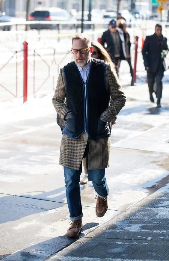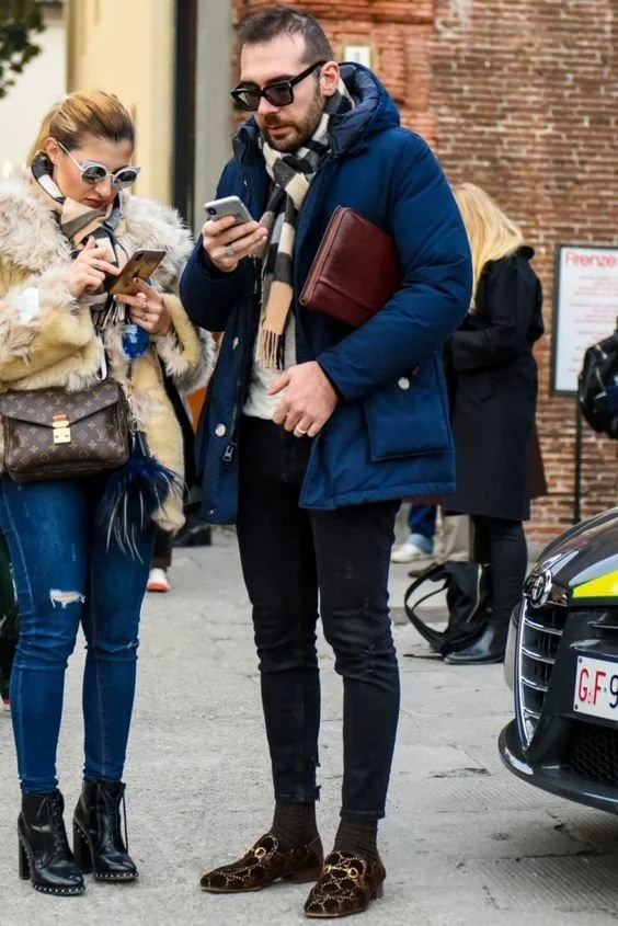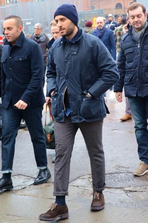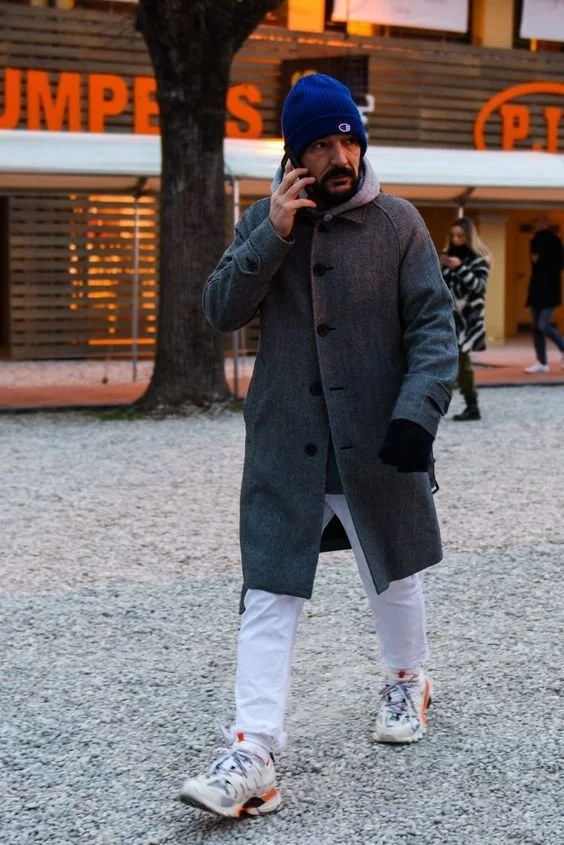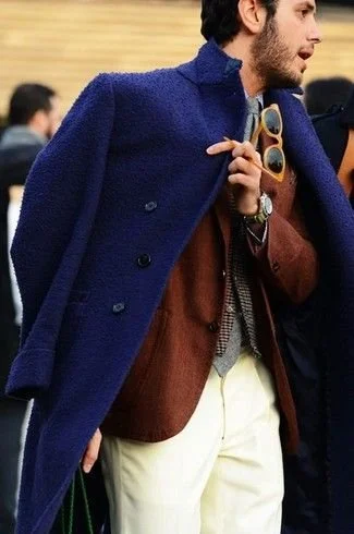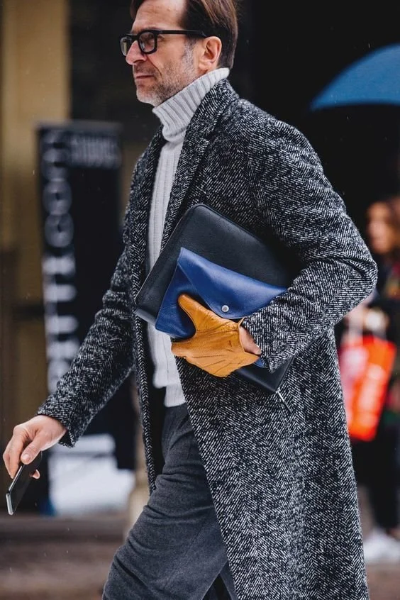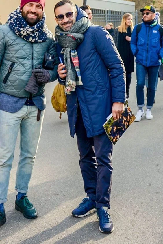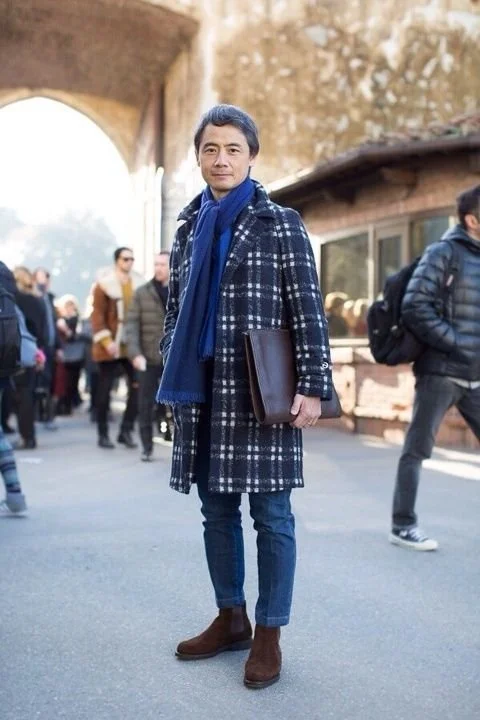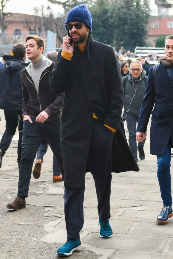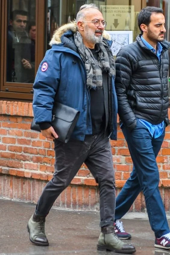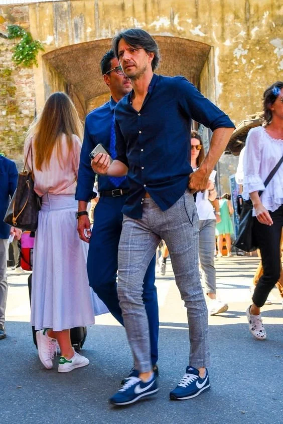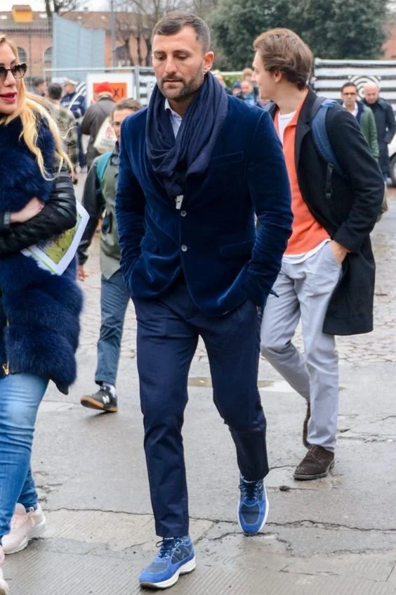 클래식 블루로 맞춰입고 깐깐한 시어머니 표정으로 걸어가는 이태리 남성.