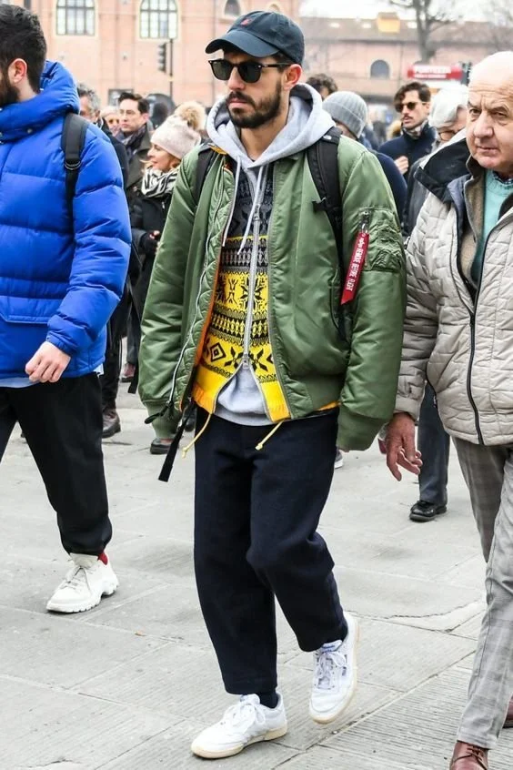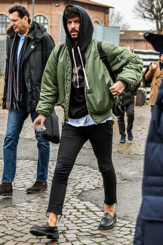 가장 기본 봄버는 역시 카키톤 올리브죠. 요즘같은 겨울에는 저렇게 후드랑 레이어드 해서 많이 입죠.