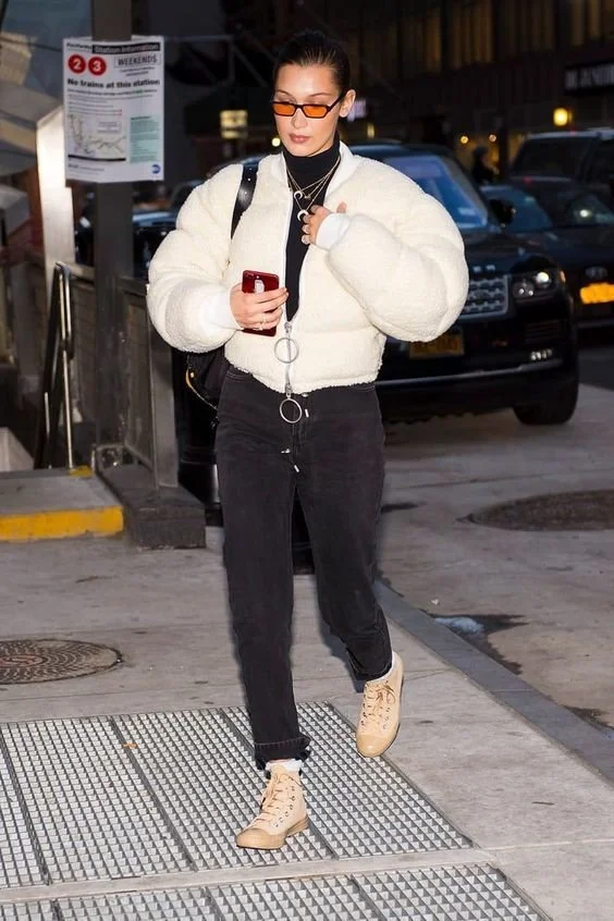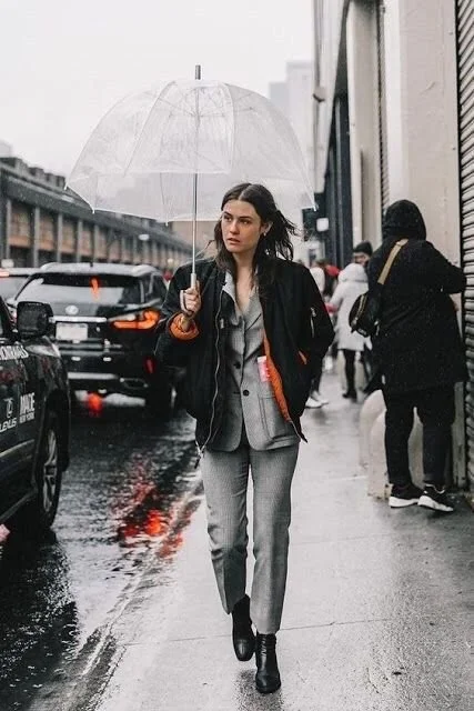 허리선이 다 드러나는 아우터라 하체의 단점이 다 드러나 보이는 터라 다리가 짧거나 너무 굵다면 어정쩡한 레귤러 핏의 바지는 단점을 더 돋보이게 할 수 있습니다.