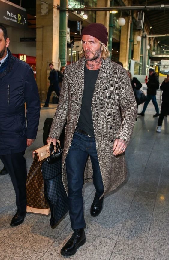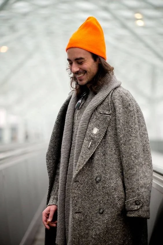 대부분 브라운계열이나 블랙 계열 헤링본을 많이 입어요. 오렌지 컬러 비니모자와 잘 어울리네요!!