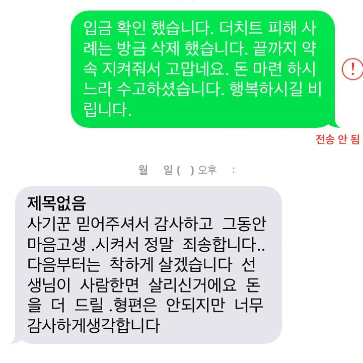따지고 보면 내가 민사 소송을 걸었어도 이 사람을 압박할 수단은 없던 것이다. 아무튼 결론을 말하자면, 그 이후 연락을 주고 받아 결국엔 돈을 다 받아내긴 했다. 다만 이미 신용불량자이신 데다가 당장의 일자리도 없으셔서, 내 돈을 마련하느라 또 사기를 치실까 지레 노파심이 들어 나는 '일용직 근로를 하시면 어떠냐' 권했다. 실제로도 그렇게 하신 건줄은 모르겠으나, 이후 일자리를 잘 구하셨는지 입금이 되었다. 물론 전액은 아니었다. 하루치 일당에 해당하는 금액이었다. 하루 일하고 받은 걸 곧장 나한테 보내신 것이다. 그렇게 총 사흘에 걸쳐 삼일치 일당이, 내가 최초 사기 당했던 금액이 모두 돌아왔다.