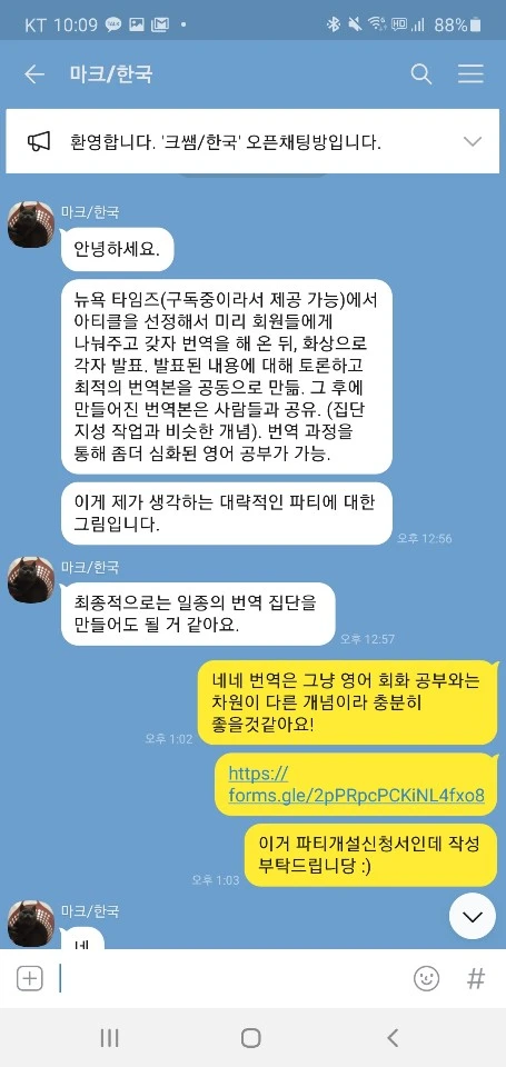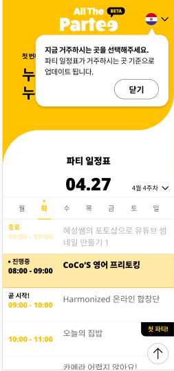 크쌤: 사람이 점차 많아지면서 서비스에 문제가 생겼어요. 톡이 너무 많이 올라오다 보니 나가는 사람도 생기고, 무엇보다도 전 세계의 사용자들이 접속하다 보니 시차 문제도 있었죠. 그래서 시간표를 볼 수 있는 원페이지 웹사이트를 프로토타입으로 만들었죠. 정말 '소통'하는 것이 즐거워서, 다른 사람들과 교류하고 문화를 배우는 것이 즐거워서 자발적으로 동참해주는 사람들을 보며 충분히 가능성 있는 시장이라고 느껴지더라고요. 이왕 벌인 일, 끝까지 도전해 보고 싶어 카톡 오픈 채팅방을 넘어, 정식 서비스 런칭을 준비하게 되었죠.
