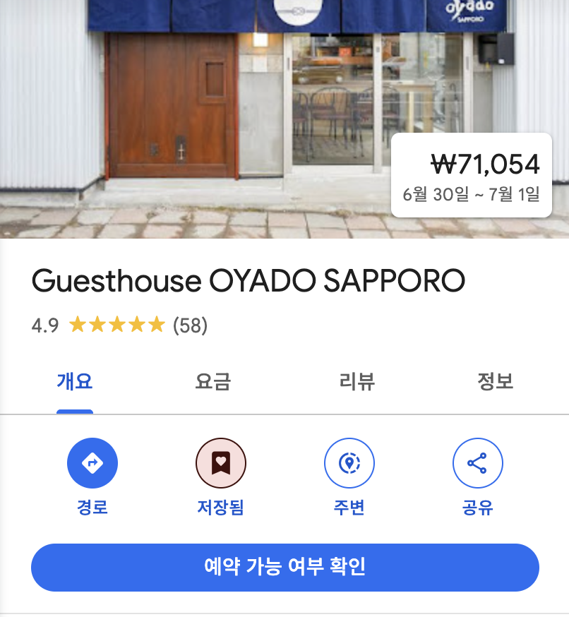 구글 평점이 4.9 인 [Oyado sapporo]라는 게스트 하우스를 예약했다.