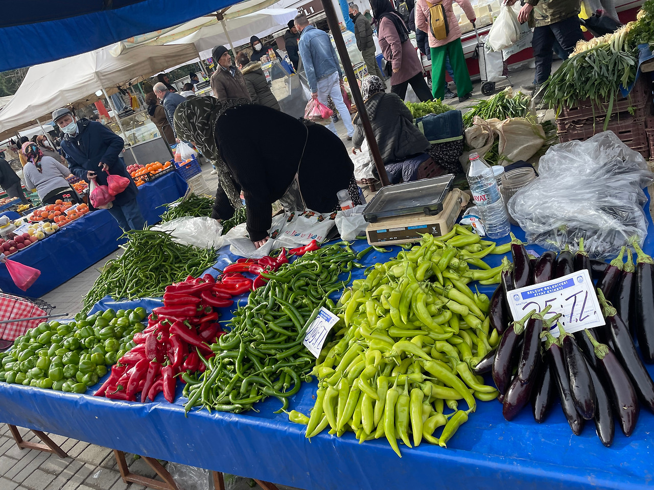 이 겨울에 온갖 종류의 과일들과 채소들이 가득하다. 셀축에 사는 모든 사람들이 이곳에서 장을 보는 것 같았다. 이런저런 공구들을 파는 노점상에서는 골동품이 많아서 사고 싶었으나 참았다. 시장이 흥미를 끄는 이유는 이곳 사람들이 뭘 먹고사는 지를 알 수 있어서다. 셀축 사람들은 우리랑 똑같이 감자와 오이와 당근과 토마토를 먹고, 우리랑 약간 다르게 여러 종류의 치즈와 온갖 종류의 절임 올리브들을 먹고살았다. 옷 가게는 우리랑 똑같이 속옷을 팔고, 양말을 팔고, 겨울이니 겨울잠바를 팔았다. 그리고 허기진 사람들을 위한 노점상과 카페들과 식당들이 즐비했다. 장터는 물건을 사고파는 셀축 사람들로 바글바글했다. 우리 같은 구경꾼은 거의 없는 듯했다.