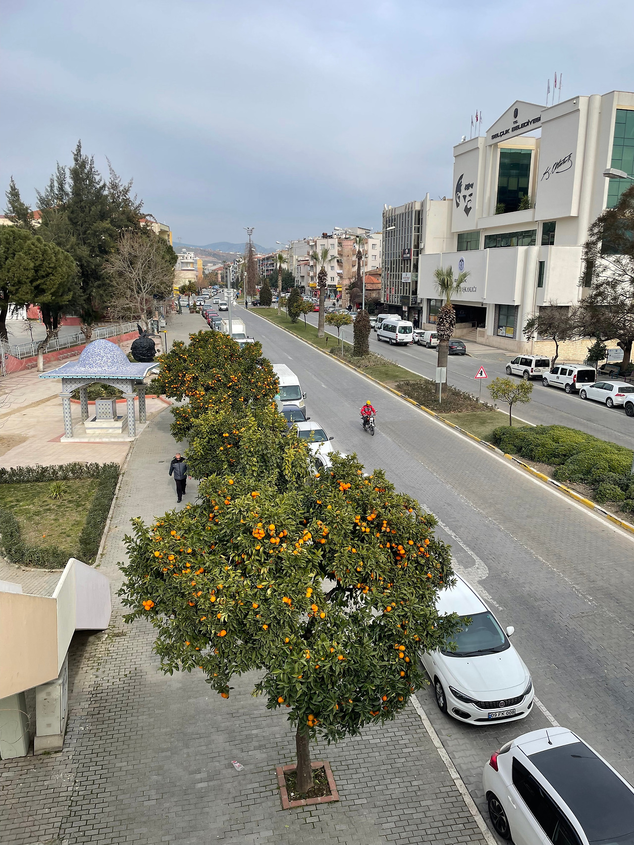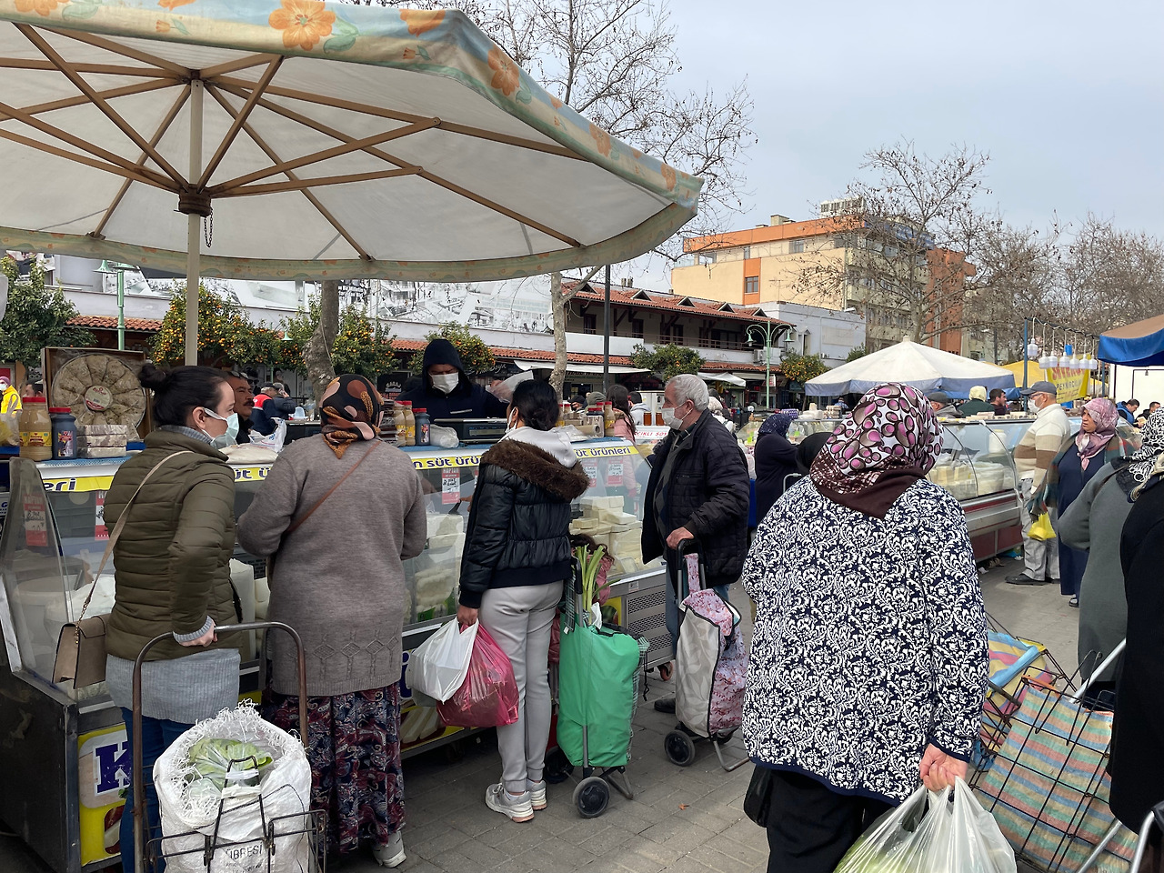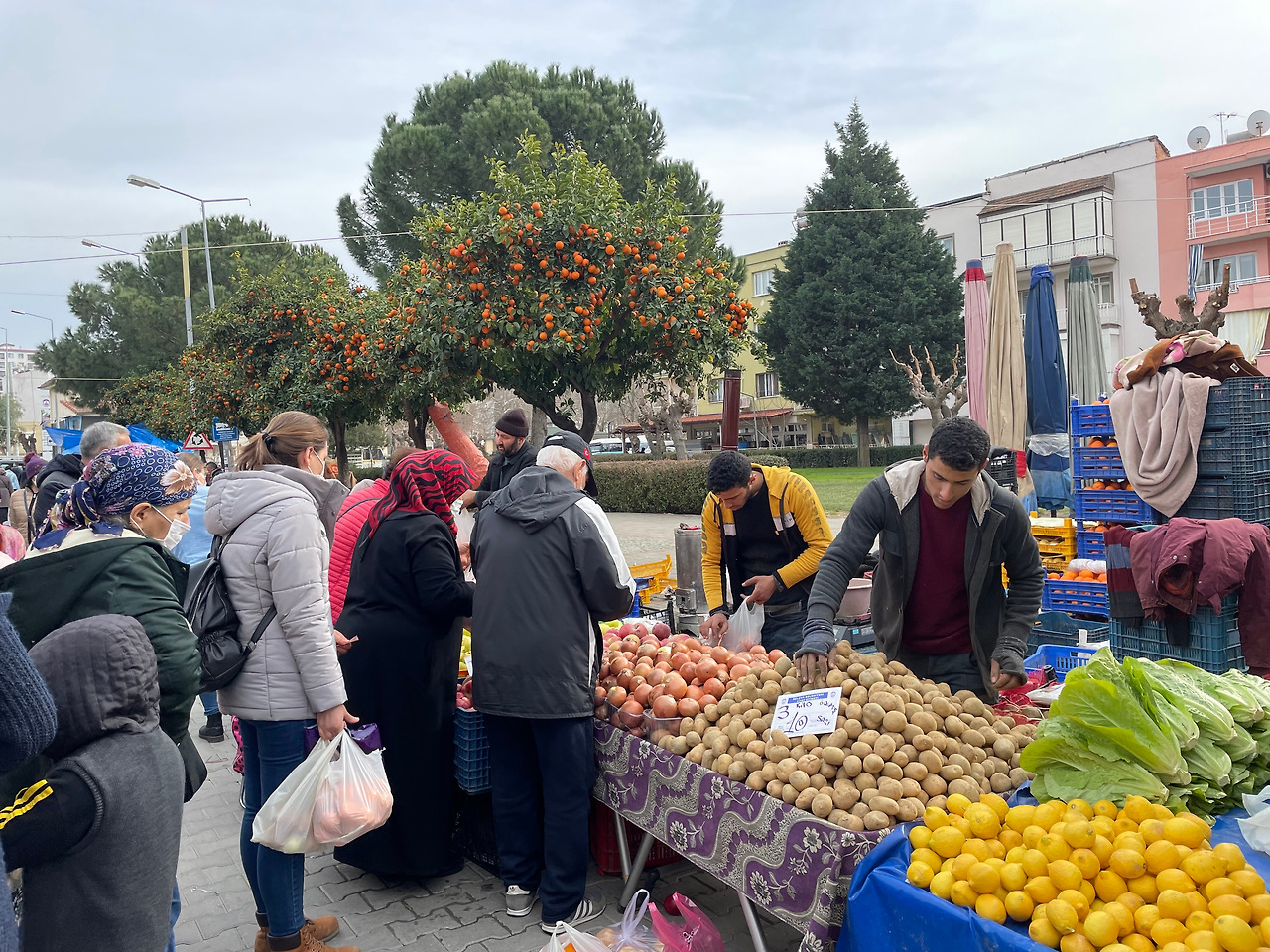 바로 토요장으로 향했다. 숙소에서 걸어 나와 큰길을 건너니 바로 보인다. 도로변 가로수에는 오렌지향이 가득하다. 아무도 안 건너는(육교가 있어도, 횡단보도가 있어도 길 건너는 건 늘 맘대로, 아무 곳이나, 아무 때나... 가 이곳 튀르키예의 매너였으니까^^) 예쁜 육교를 건너 왁자지껄한 시장으로 향했다. 셀축 토요장은 우리나라의 지방에서 열리는 오일장, 황학동의 골동품 시장, 남대문시장의 옷가게, 가락동 청과물시장 등을 두루 합한 듯한 모습이었다.