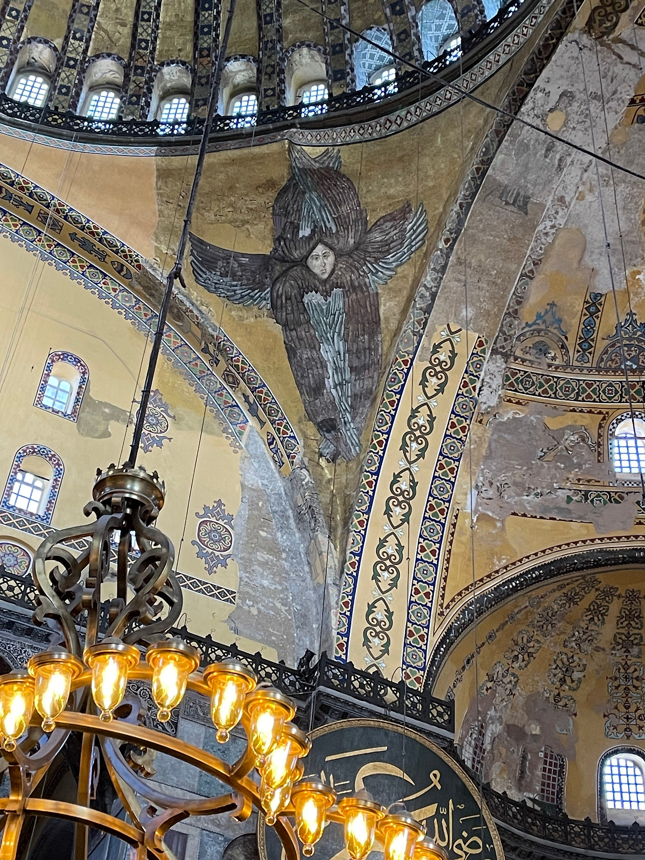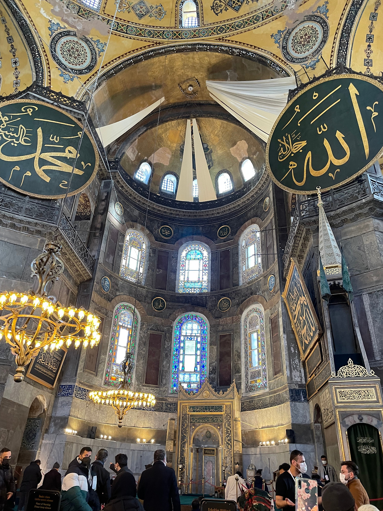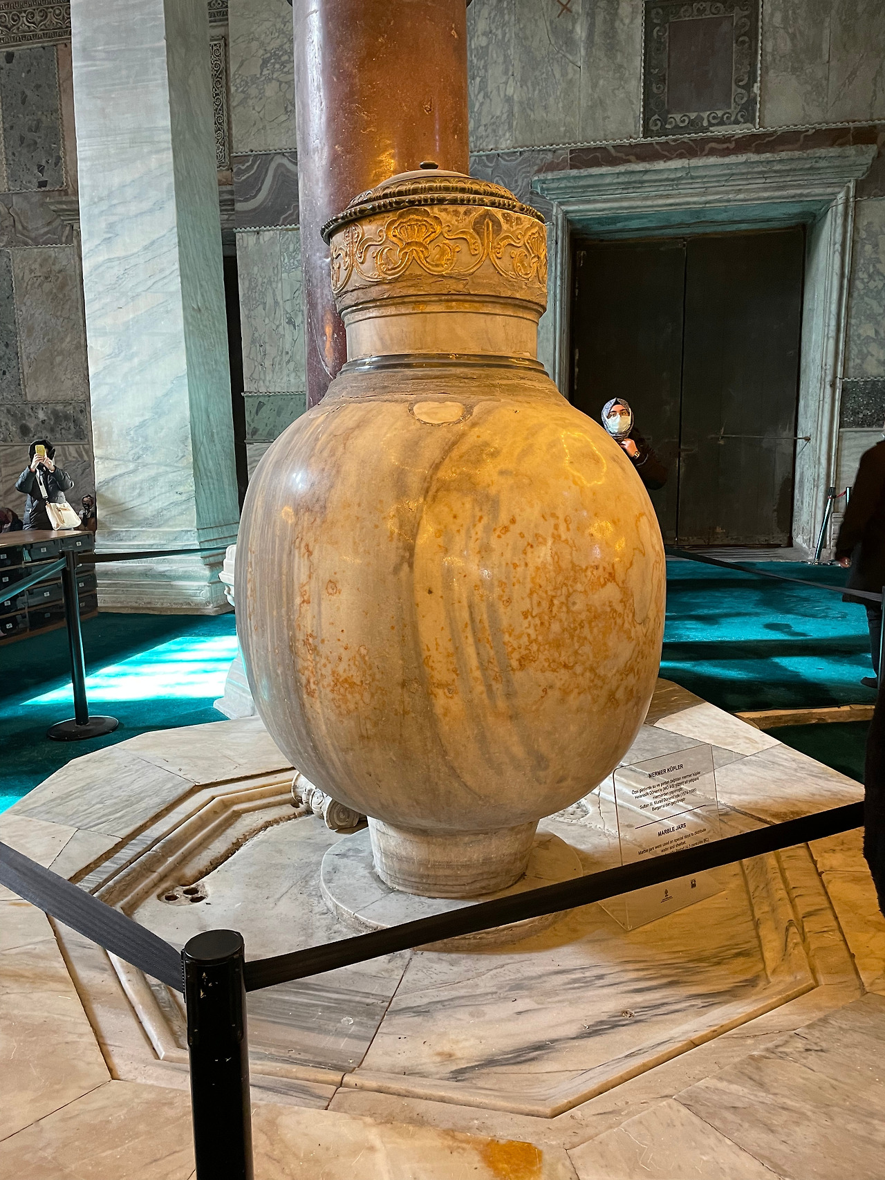 유럽에서 익히 보아왔던 거대한 교회 건물에 오스만식 코란 문자가 사방에 걸려있고, 모스크에서 흔히 보던 샹들리에가 화려하게 빛나는 곳, 작은 기도실조차 화려한 금으로 치장한 곳이다. 건물을 장식한 대리석에 눈길이 갔다. 모스크는 기도하는 사람들을 위해 양탄자를 깔았기 때문에 방문객을 위해 열린 일부 구간만 구경했을 뿐인데, 거의 1,500년이 다 된 대리석은 아직도 화려했다. 그 큰 성당의 바닥이 온통 그 화려한 대리석으로 가득하다니. 천년 전 이 성당은 얼마나 아름답고 화려 했을까를 추측해 본다. 성당의 본당 안쪽 양옆으로는 대리석 항아리가 놓여 있었는데, 고대 페르가몬 왕국에서 가져온 것이라고 한다. 이 항아리 역시 감히 가까이 다가가기도 어려울 만큼 진귀해 보였다.