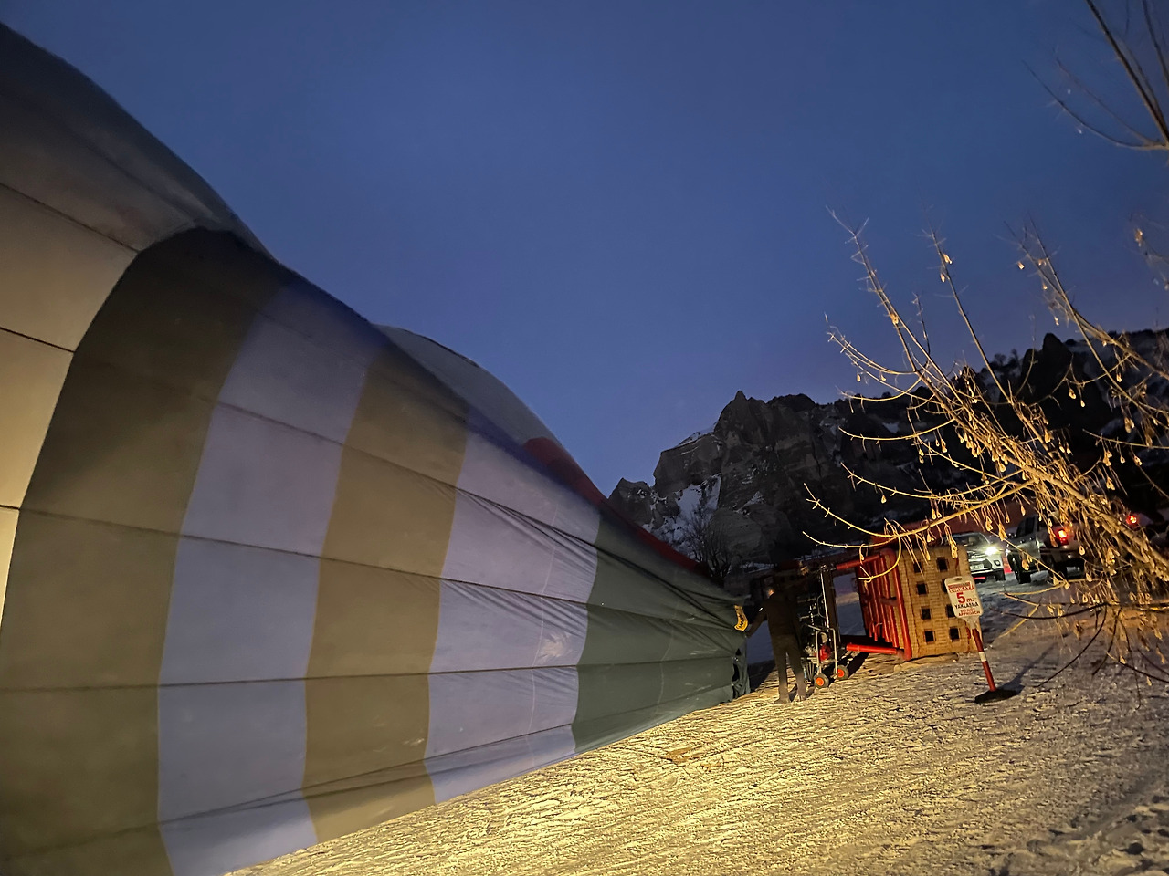 드디어 벌룬이 뜨는 장소에 도착한 듯했다. 어두컴컴해서 잘 보이지 않았다. 잠시 뒤 벌룬 같은 비닐이 앞에 펼쳐졌다. 밖에 나가 보니 거대한 벌룬이 누워 있었고 몇 사람이 곁에서 뭔가 작업을 하는 것 같았다. 너무 추우니 차 안에서 기다리는 말을 했고, 그래도 궁금해서 밖에 나가 벌룬이 펼쳐지는 걸 구경했지만, 아직도 벌룬은 우리 거 하나밖에 보이지 않았다. 너무 추워 차 안으로 들어왔다.