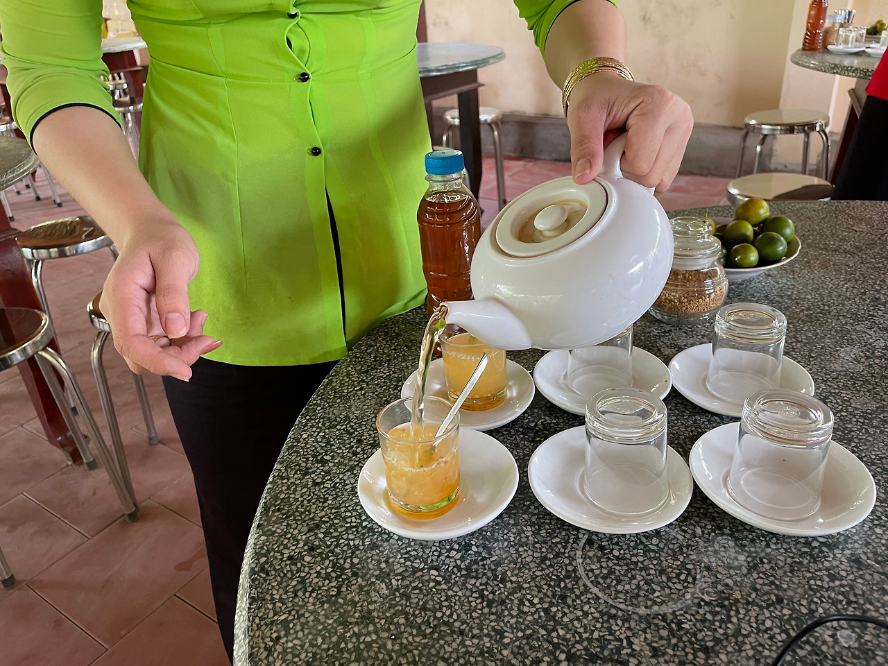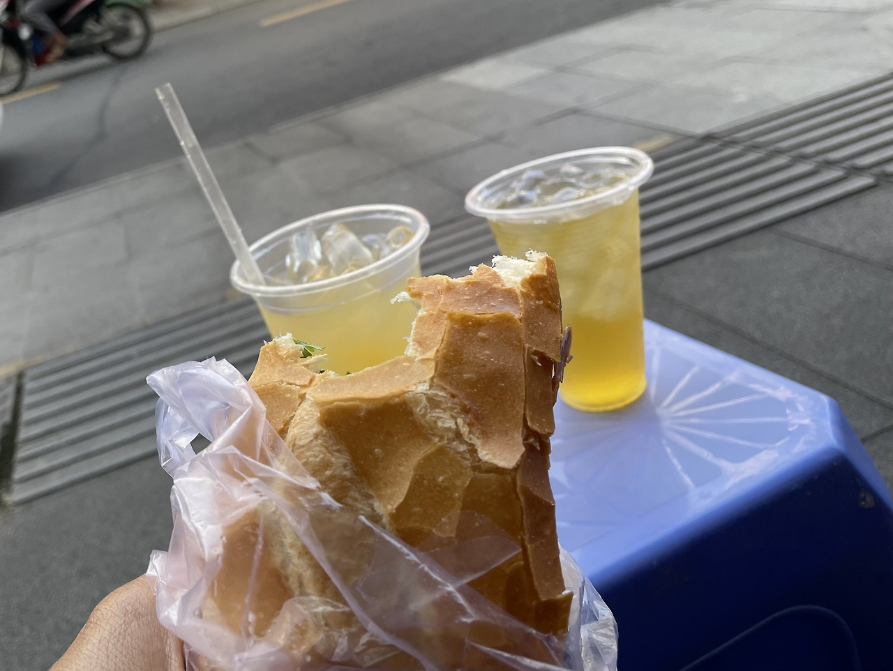 이른 아침 투어에 참석하기 위해 여행자 거리로 나왔다. 투어버스를 기다리는 동안 길거리에서 파는 반미 샌드위치와 오렌지주스 그리고 짜다(얼음 녹차)를 먹는다. 오늘은, 우리 스타일의 여행이다. 샌드위치는 우리 돈으로 약 2,000원 정도, 오렌지주스와 짜다는 둘 다 합쳐서 3,000원 정도. 1인당 5,000원으로 아침식사를 해결했다.