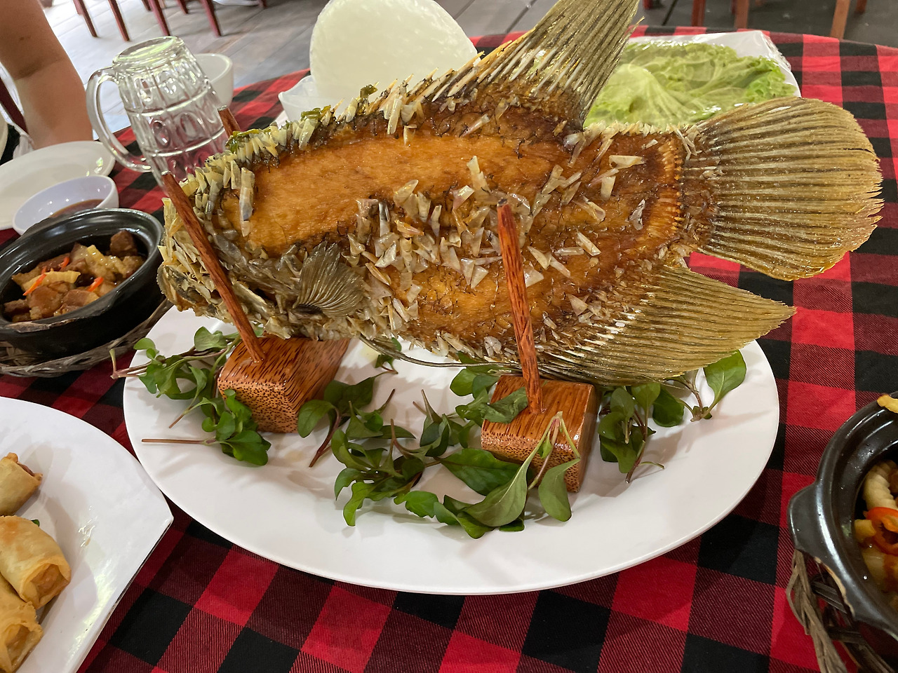 점심식사는 작은 보트로 이동했다. 식당으로 가는 길에 보이는 용과 열매가 무척 아름답고 신기했다. 식사 때 나오는 생선은 엘리폰트이어피쉬 라고 하는데, 생선살과 야채를 라이스페이퍼에 싸서 먹으라고 설명해 준다.