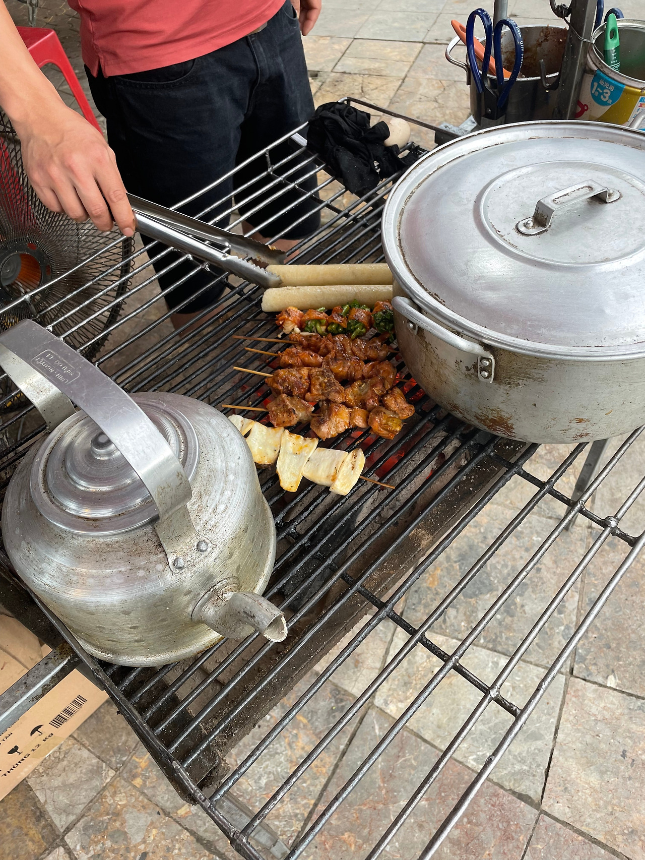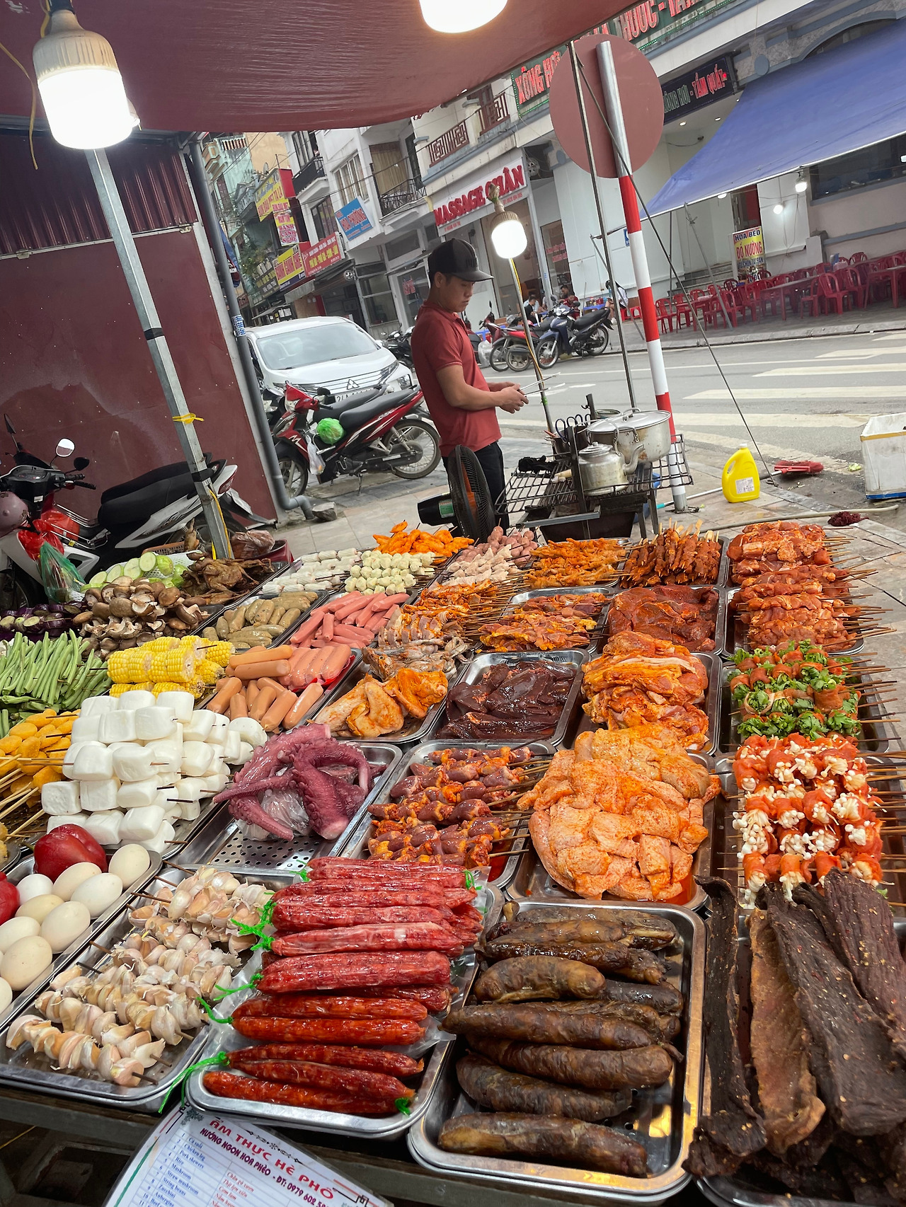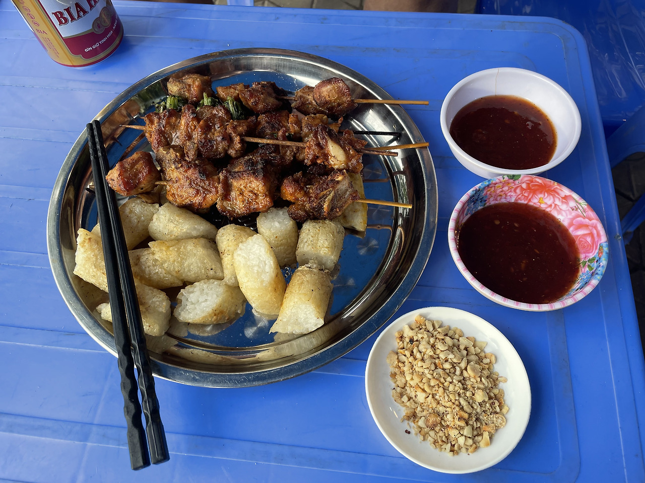 저녁은 유명하다는 꼬치구이다. 돼지고기류와 대나무 덮밥, 버섯구이 그리고 야채말이 고기구이와 맥주를 먹어 보았다. 190,000동. 대나무밥이 의외로 맛있다. 속은 찰기가 있고 겉은 바삭하게 구워졌다. 소스와 야채, 땅콩가루를 곁들여 먹는다. 야채말이 고기구이도 괜찮았다. 다른 꼬치들은 그냥 숯불구이 맛이다.