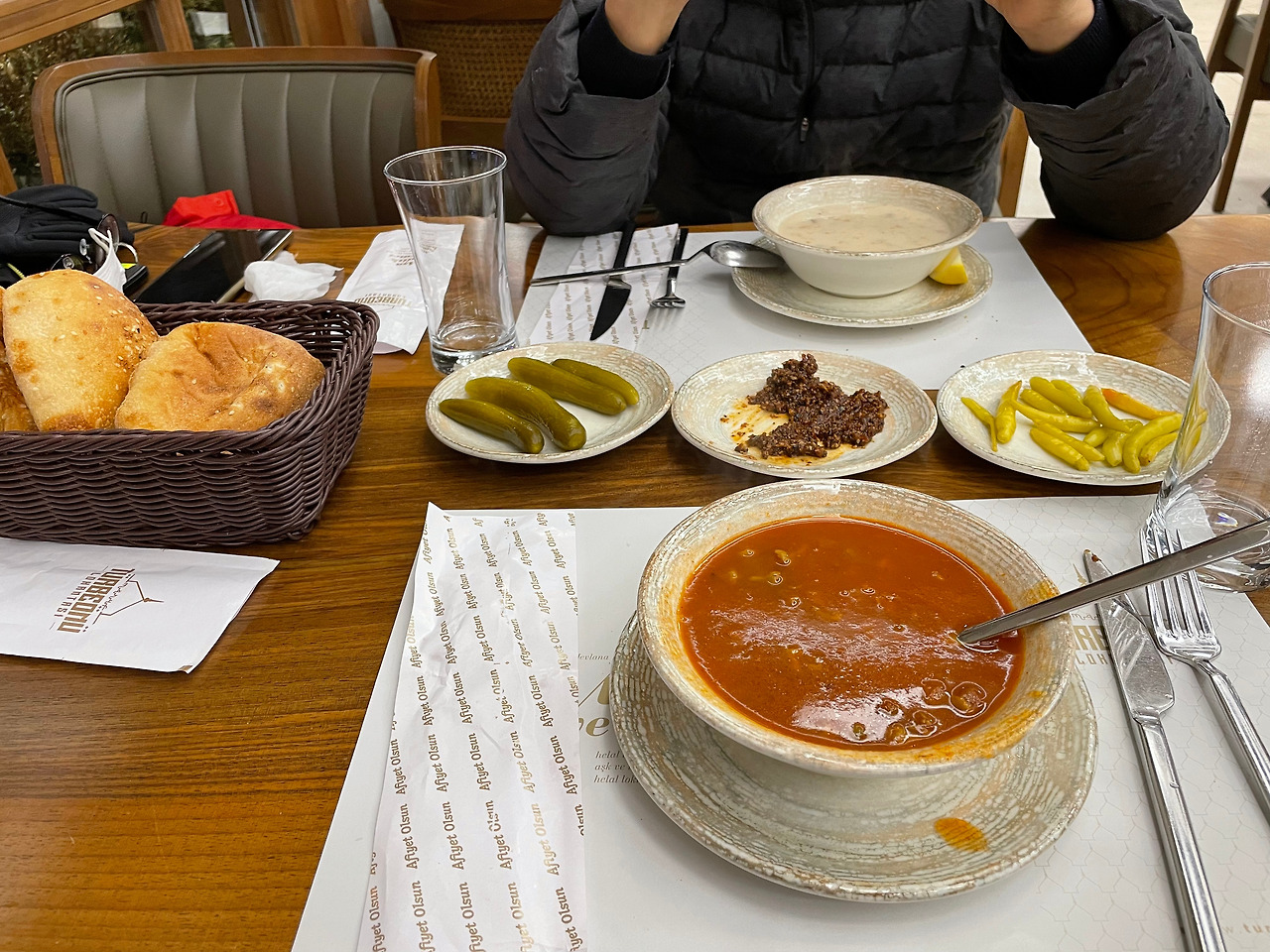 사실 엘레나 성당을 찾아다닐 때부터 진눈깨비는 짙어졌고, 우산도 없었다. 몸이 쉴 곳이 필요했다. 근사한 분위기의 레스토랑으로 서둘러 들어갔다. 이미 사람들이 가득했다. 금방이라도 함박눈이 내릴 것 같은 어두운 날씨와는 달리 레스토랑 안은 경쾌하고 즐거웠다. 우리도 그들 틈에서 튀르키예의 전주 한정식 같은 전통식단으로 점심을 먹었다. 테이블 위에서는 더블 폿이 차이를 따뜻하게 데워주고 있었다.