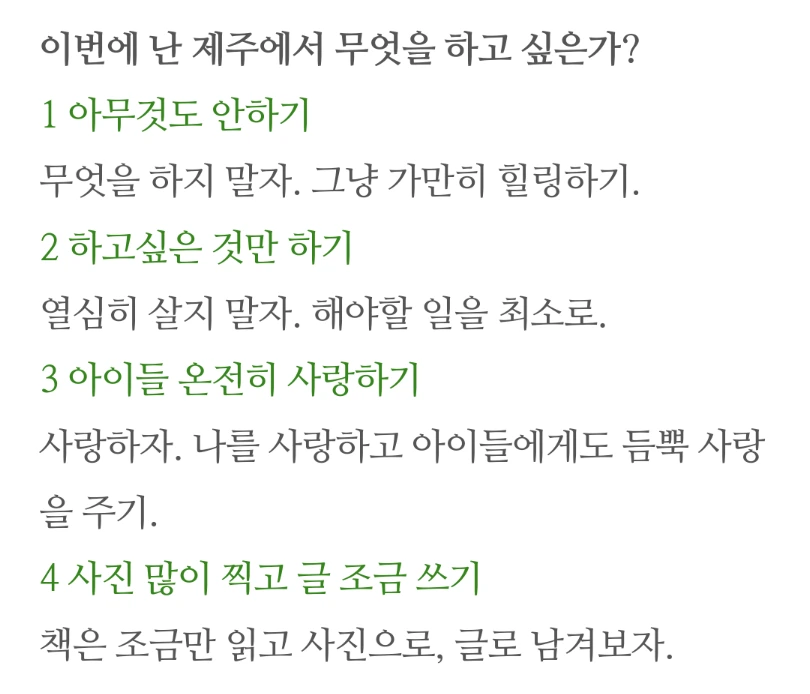 늘 그렇듯 여행 전엔 분주하다. 작년엔 더욱 그랬다. 한 달 동안 쉬려고 생각하니 끝내 놓을 일이 어찌나 많던지. 한 달이란 공백을 미리 채우기 위해 두 배로 바쁘게 지냈던 것 같다. 몇 가지 온라인 강의를 듣고 있었는데 여행 가서는 뭐 하기가 싫어 막판에 다 듣느라 혼났다. 막상 여행 준비는 별로 하지 못하고 떠나게 되었다. 어디어디 가고 싶은지 메모해두고, 서평단에 당첨되어 제주 여행책 하나를 리뷰하고 그것 하나 의지해서 제주도로 떠났다.