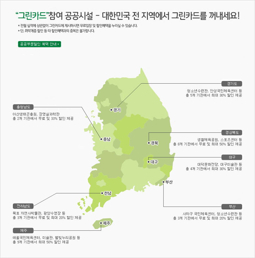 그린카드는 매표소에 에코머니 제휴 스티커가 부착되어있다면 사용할 수 있다. 단 카드 소지자 1인에 대해 서비스가 제공된다니 가족 개인별로 만들어야 한다. 제주도에서는 제주도립박물관과 제주 현대미술관 입장료가 무료다. 그리고 일부 관광지는 녹색관광지로 지정되어 그린카드를 사용할 수 있다고 한다. 할인 여부는 계속 변동되기 때문에 방문 전에 미리 확인해야 한다. 할인처가 많진 않아 사용할 일이 있을까 싶지만 하나 만들어두면 이곳저곳 여행할 때 한 번씩 사용할 수 있을 것 같다.
