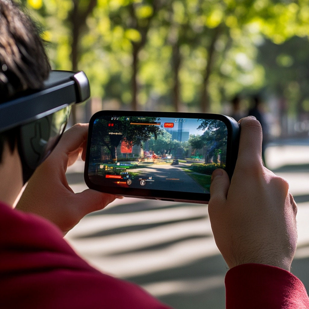 A person wearing AR glasses playing a mobile game in a park, virtual game elements overlaid on the real environment, photorealistic style