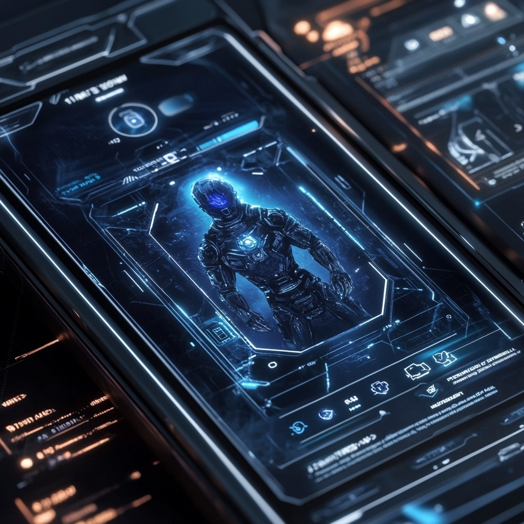 An AI-powered mobile game interface showing personalized content and intelligent NPCs, futuristic UI design, blue and white color scheme