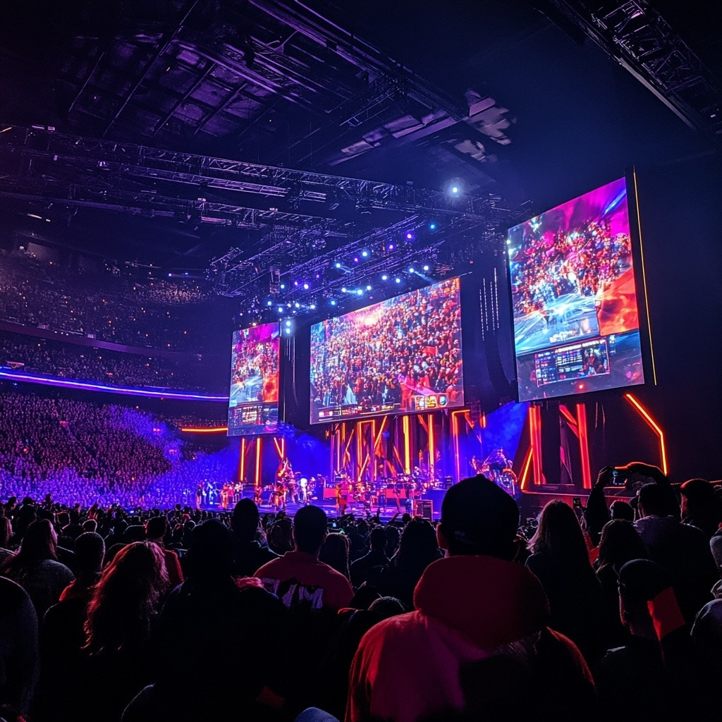 A crowded stadium hosting a mobile esports tournament, players on stage, large screens showing gameplay, enthusiastic audience