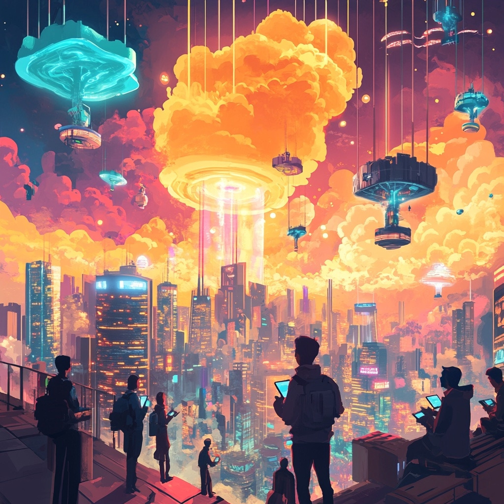 A futuristic cityscape with people playing cloud-based mobile games on various devices, 5G towers visible in the background, vibrant colors, digital art style