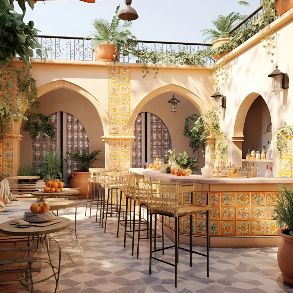 카페 인테리어 8. 지중해와 로맨틱: 지중해와 로맨틱한 분위기를 갖춘 카페 디자인을 만드십시오. 따뜻한 색상, 테라코타 타일, 지중해 모티프를 사용합니다. 전망이 좋은 야외 좌석을 도입하여 마법같이 아름답고 친밀한 식사 경험을 만듭니다.
