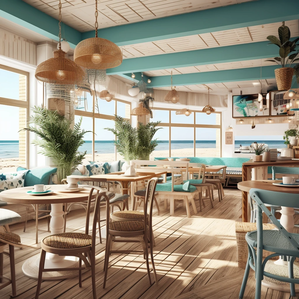 카페 인테리어 5. 해변에서 영감을 얻은 디자인: 해변 테마를 강조한 카페 인테리어를 디자인하십시오. 편안하고 여유로운 특징들을 강조하며, 모래 색상의 팔레트, 해양 장식, 해변에서 영감을 얻은 텍스처 등의 요소를 사용하여 해변의 고요함을 불러일으킵니다.