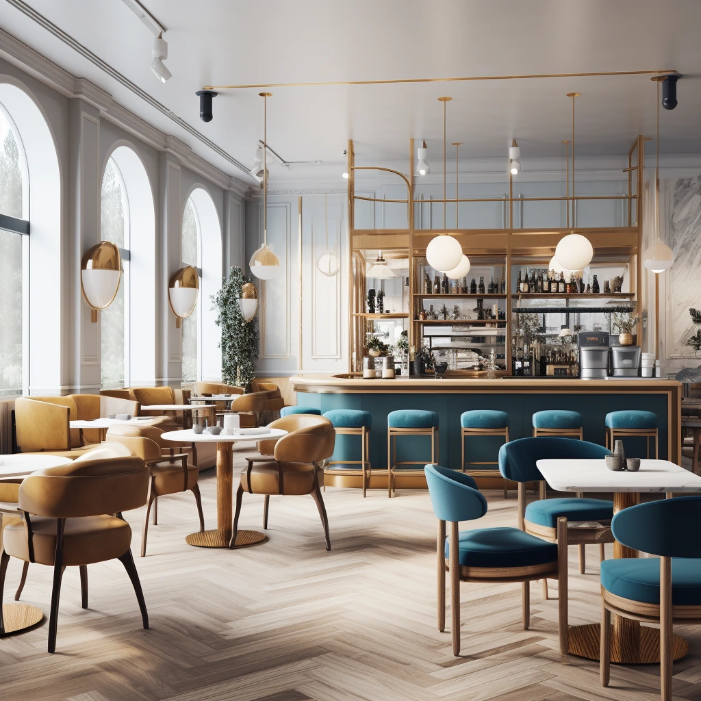 카페 인테리어 3. 미드 센추리 유럽 스타일: 미드 센추리 미학을 반영한 카페 인테리어를 디자인하십시오. 다양한 소재와 영향을 혼합하여, 전통적인 유럽 디자인 요소와 현대적인 터치를 결합합니다. 풍부한 색상, 우아한 가구, 장식 조명을 사용하여 세련되고 초대감 있는 공간을 만들어냅니다.