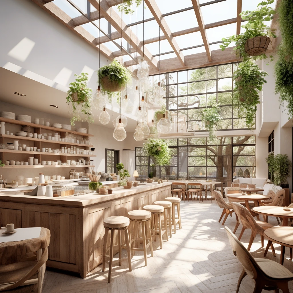 카페 인테리어 6. 자연광 카페: 자연광을 최대화하는 카페 디자인을 만드십시오. 큰 창문, 천창, 밝은 색상 팔레트를 사용하여 밝고 공기가 통하는 공간을 만듭니다. 자연 소재와 식물을 도입하여 야외와의 연결을 강화합니다.