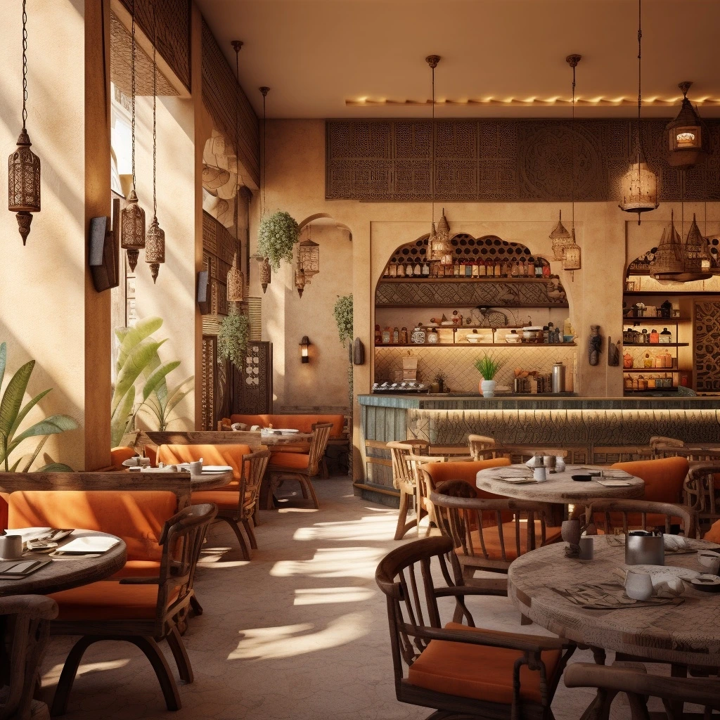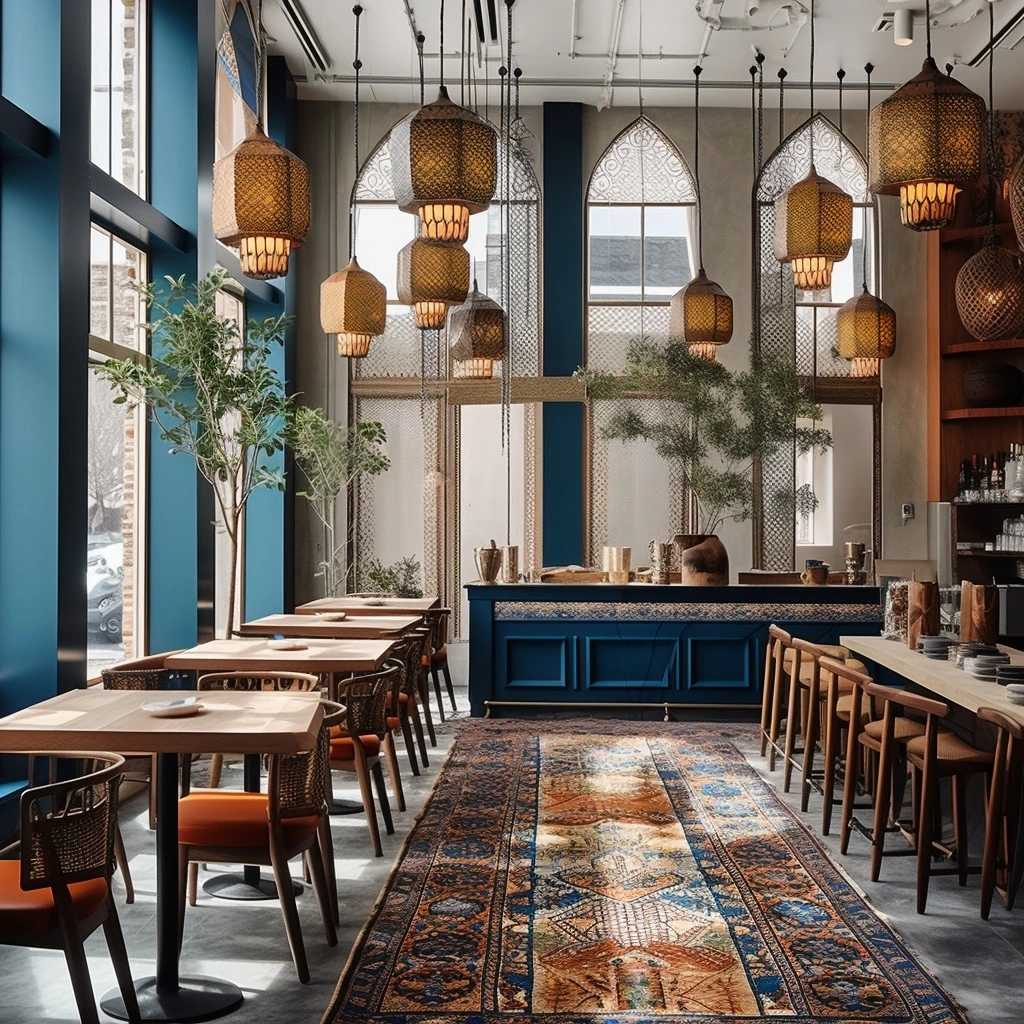 카페 인테리어 10. 아프가니스탄과 아와디의 융합: 아프가니스탄과 아와디 디자인 감각을 현대 요소와 결합한 카페 인테리어를 디자인하십시오. 전통적인 카펫, 세련된 조명, 조화로운 색상 팔레트를 사용하여 전통과 현대를 균형 있게 조화시키는 공간을 만듭니다.