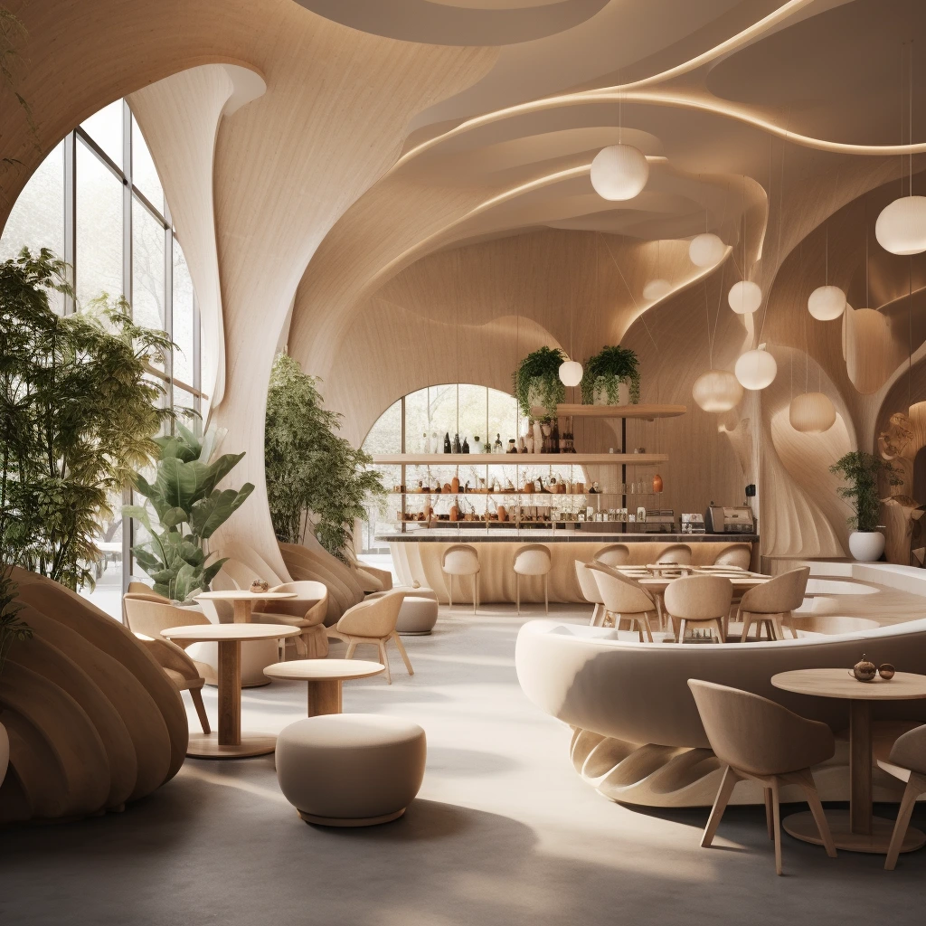 카페 인테리어 1. 대담하고 유려한 곡선: 자연의 형태를 따라 대담하고 유려한 곡선이 특징인 카페 인테리어를 디자인하십시오. 최소한의 요소와 매끄러운 형태를 사용하되, 유기적인 모양과 유동성에 초점을 맞추어 자연의 아름다움과 우아함을 불러일으킵니다.