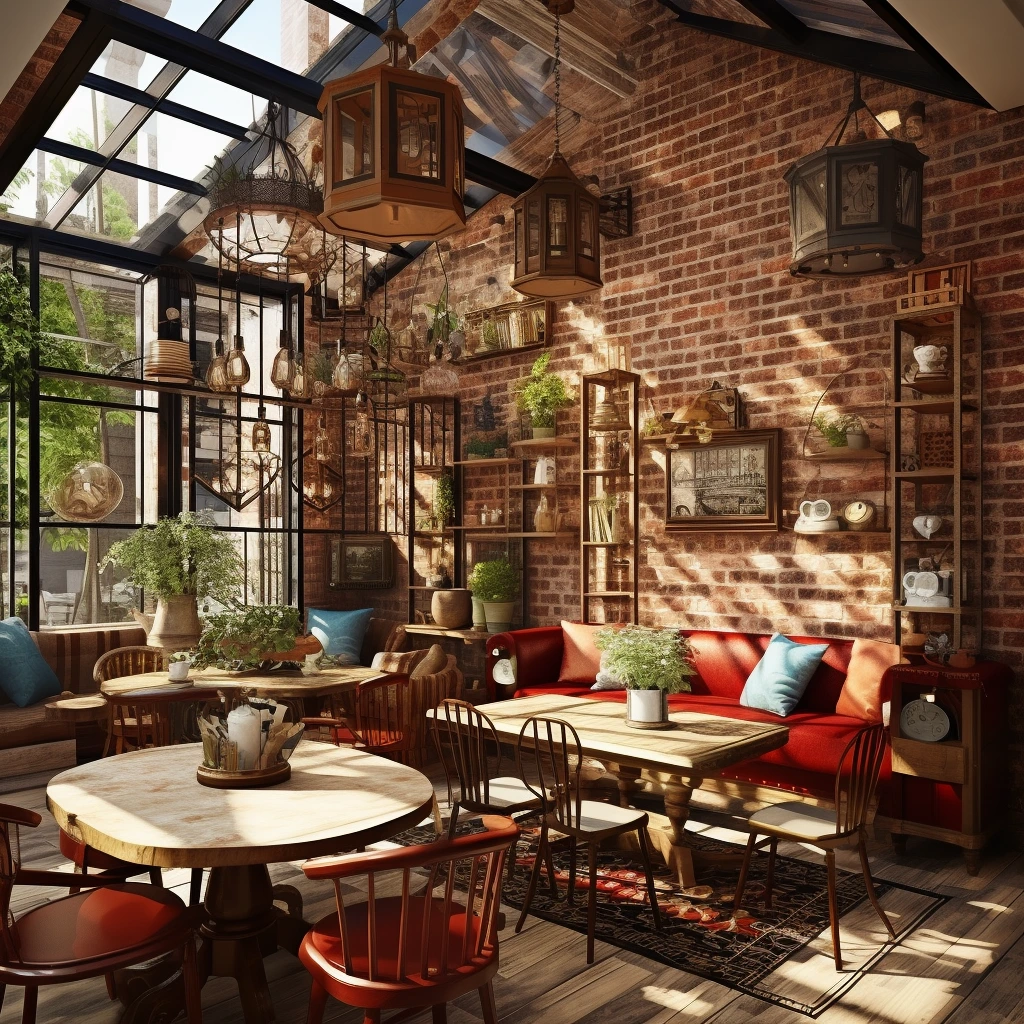 카페 인테리어 4. 전통적인 골동품의 혼합: 현대적인 설정에 전통적인 골동품을 도입한 카페 인테리어를 만드십시오. 고요한 붉은 벽돌 작업, 대담한 패턴, 현대적인 유리 외관을 사용하여 오래된 것과 새로운 것의 혼합에 초점을 맞춥니다. 전통적인 가구와 골동품을 도입하여 캐릭터와 깊이를 더해줍니다.